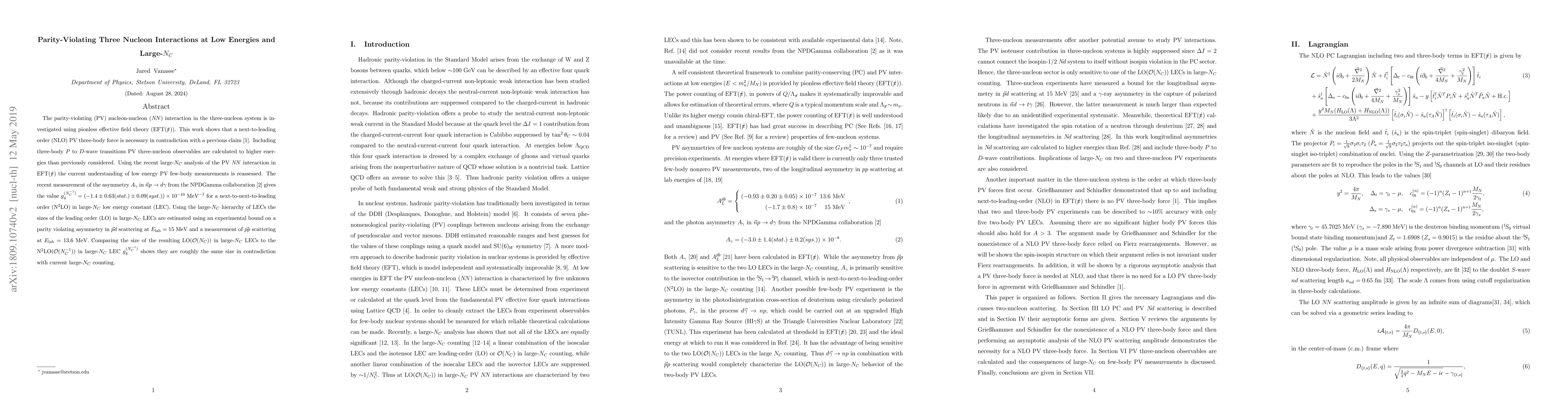 This paper investigates parity-violating three-nucleon interactions using pionless effective field theory, finding that a next-to-leading order PV three-body force is necessary. It reassesses low-energy PV few-body measurements and compares leading order and next-to-next-to-leading order large-$N_{C}$ low energy constants, revealing they are of similar magnitude contrary to current large-$N_{C}$ counting rules.