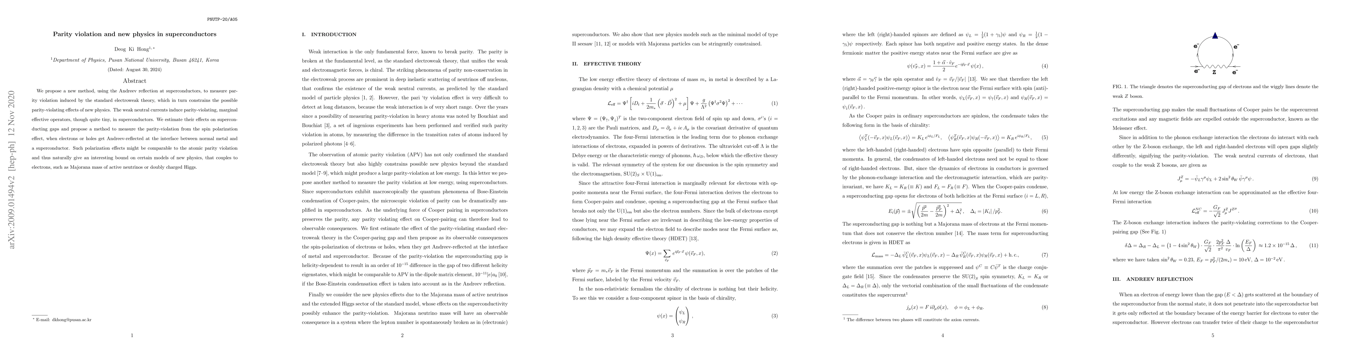 This paper proposes a novel method to measure parity violation in superconductors via Andreev reflection, which can constrain new physics models. The study estimates the effects of weak neutral currents on superconducting gaps and suggests a way to detect spin polarization effects at the interface between normal metal and superconductor, potentially providing bounds on new physics models like Majorana mass and doubly charged Higgs.