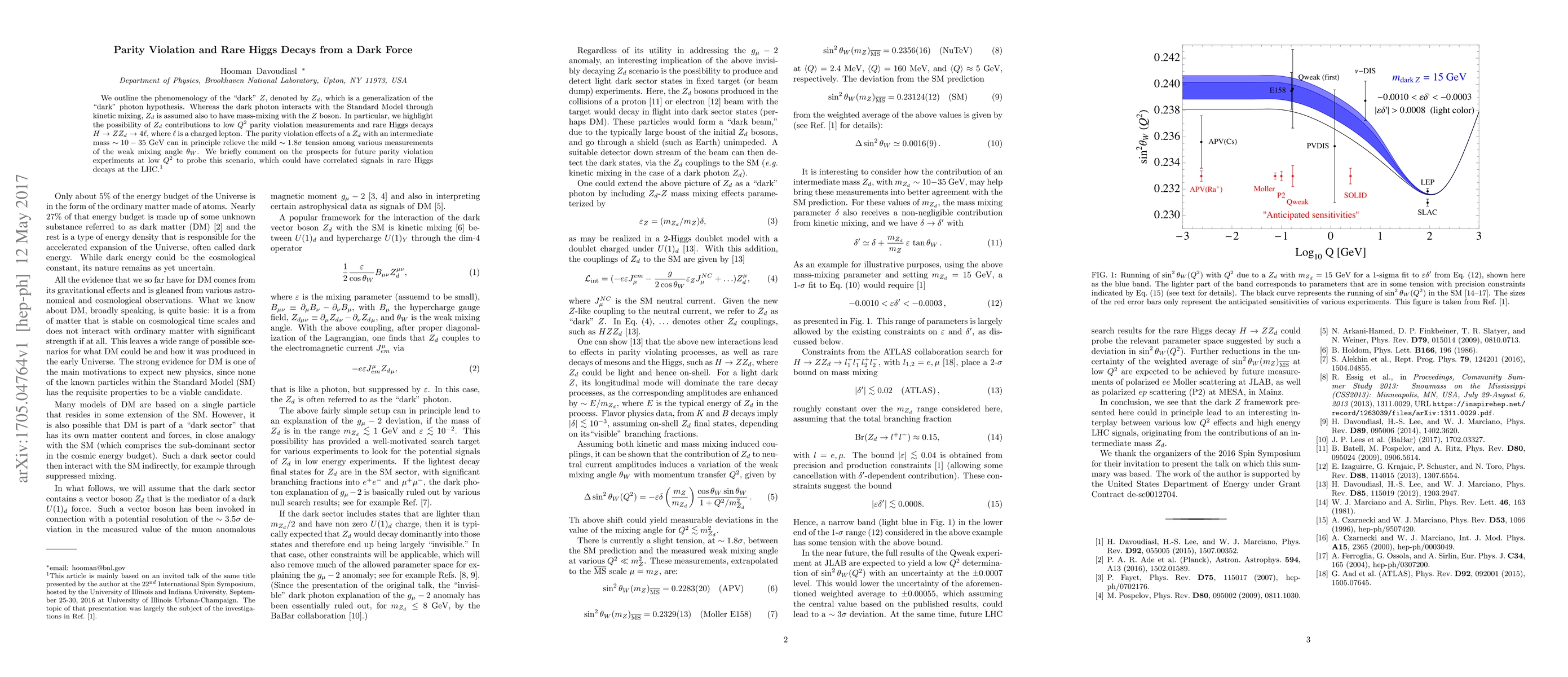 The paper introduces a generalized 'dark' Z (Zd) boson model with mass-mixing with the Z boson, in addition to kinetic mixing, and examines its implications for parity violation and rare Higgs decays.