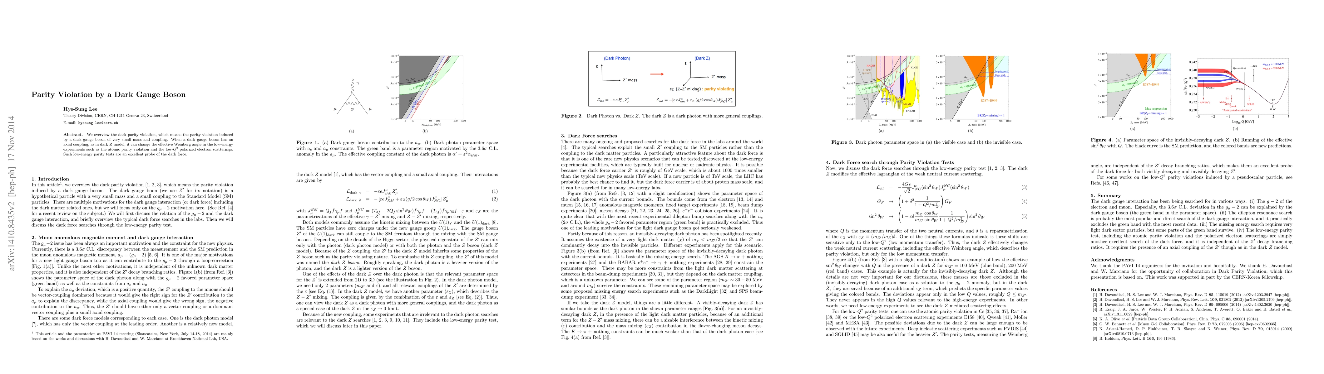 We overview the dark parity violation, which means the parity violation induced by a dark gauge boson of very small mass and coupling. When a dark gauge boson has an axial coupling, as in dark Z model, it can change the effective Weinberg angle in the low-energy experiments such as the atomic parity violation and the low-Q^2 polarized electron scatterings. Such low-energy parity tests are an excellent probe of the dark force.