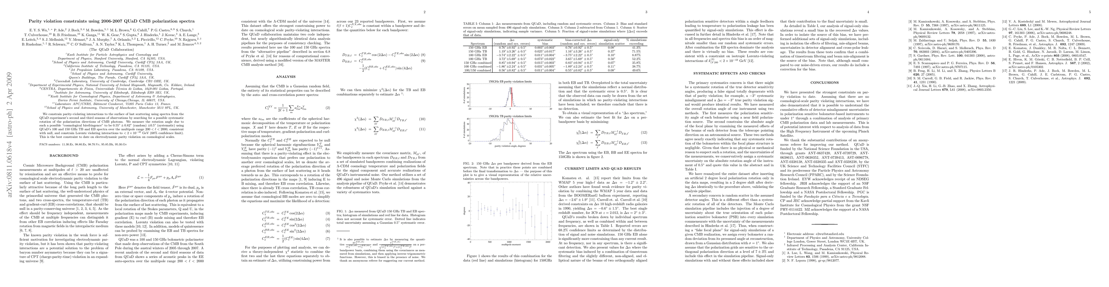 We constrain parity-violating interactions to the surface of last scattering using spectra from the QUaD experiment's second and third seasons of observations by searching for a possible systematic rotation of the polarization directions of CMB photons. We measure the rotation angle due to such a possible "cosmological birefringence" to be 0.55 deg. +/- 0.82 deg. (random) +/- 0.5 deg. (systematic) using QUaD's 100 and 150 GHz TB and EB spectra over the multipole range 200 < l < 2000, consistent with null, and constrain Lorentz violating interactions to < 2^-43 GeV (68% confidence limit). This is the best constraint to date on electrodynamic parity violation on cosmological scales.