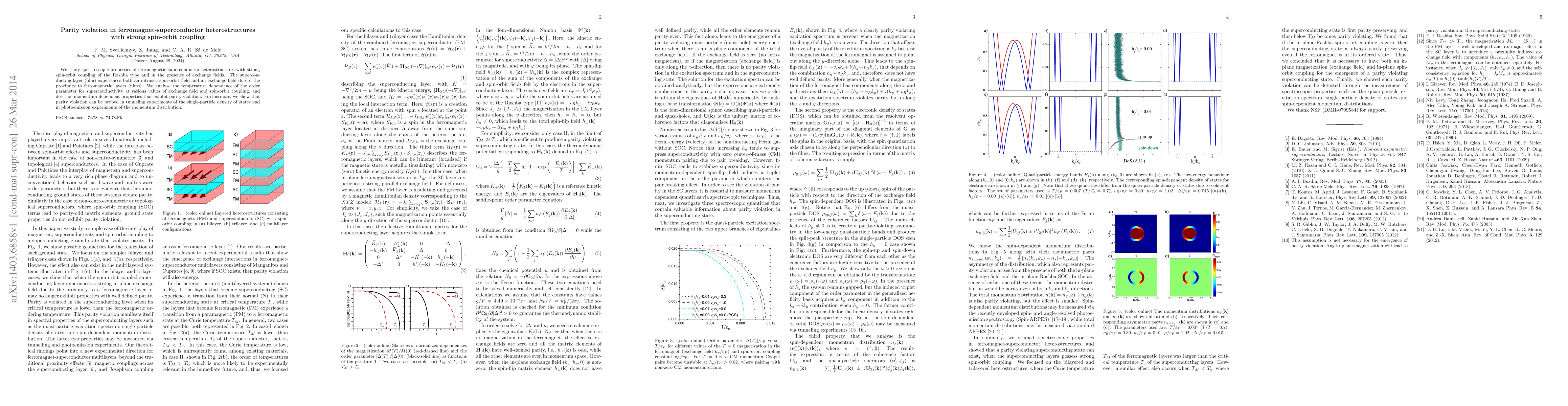 This paper investigates the spectroscopic properties of ferromagnet-superconductor heterostructures with strong Rashba spin-orbit coupling, revealing temperature-dependent superconductivity and momentum-dependent parity violation. Experiments show that these phenomena can be detected via tunneling and photoemission techniques.