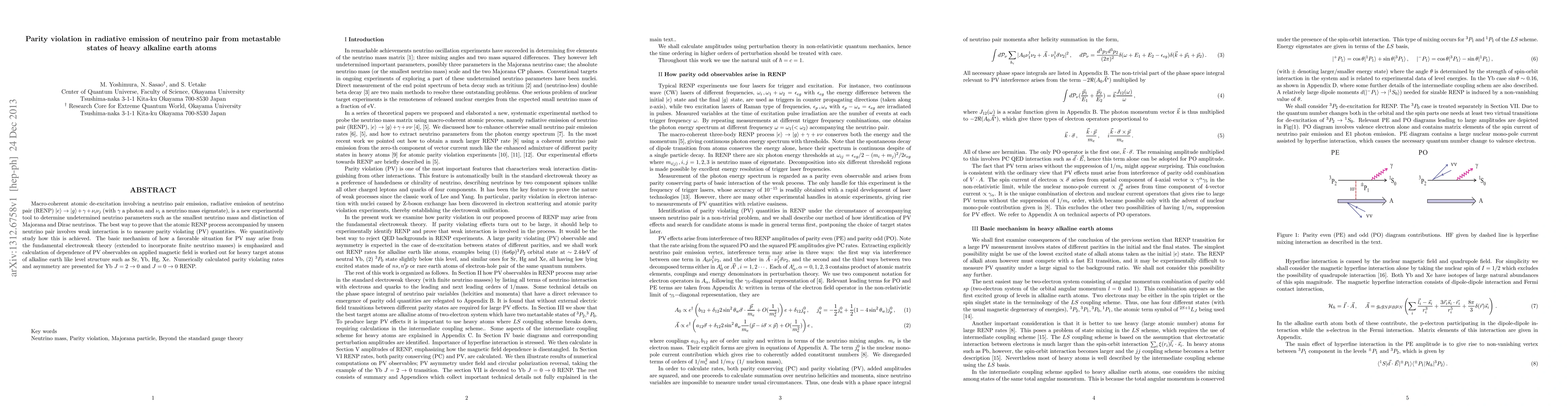 This paper investigates the parity violation in the radiative emission of neutrino pairs from metastable states of heavy alkaline earth atoms, aiming to determine undetermined neutrino parameters. It explores the mechanism for parity violation in the atomic radiative neutrino pair emission process and calculates the dependence of parity violating observables on magnetic fields for specific heavy atoms.
