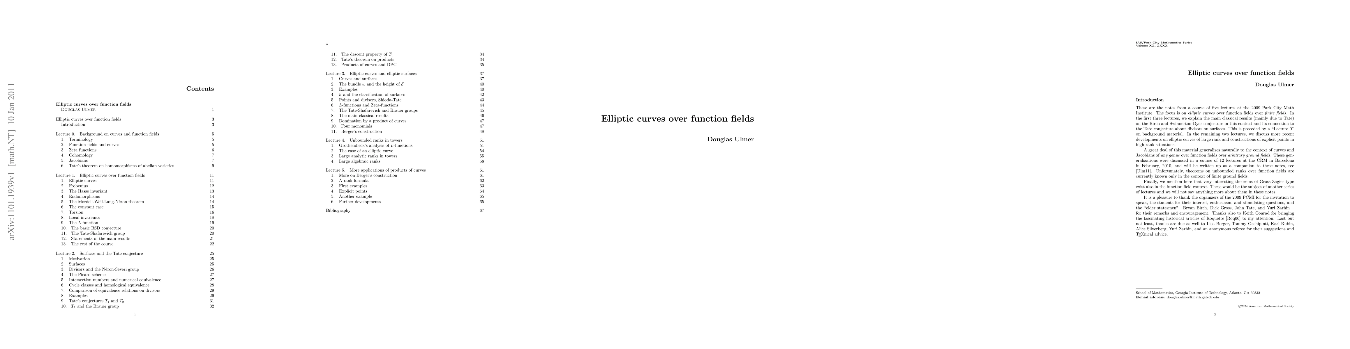 This paper summarizes five lectures on elliptic curves over function fields given at the 2009 Park City Math Institute, detailing classical results on the Birch and Swinnerton-Dyer conjecture and recent advances in high-rank elliptic curves. It includes foundational background material and explores connections to the Tate conjecture.