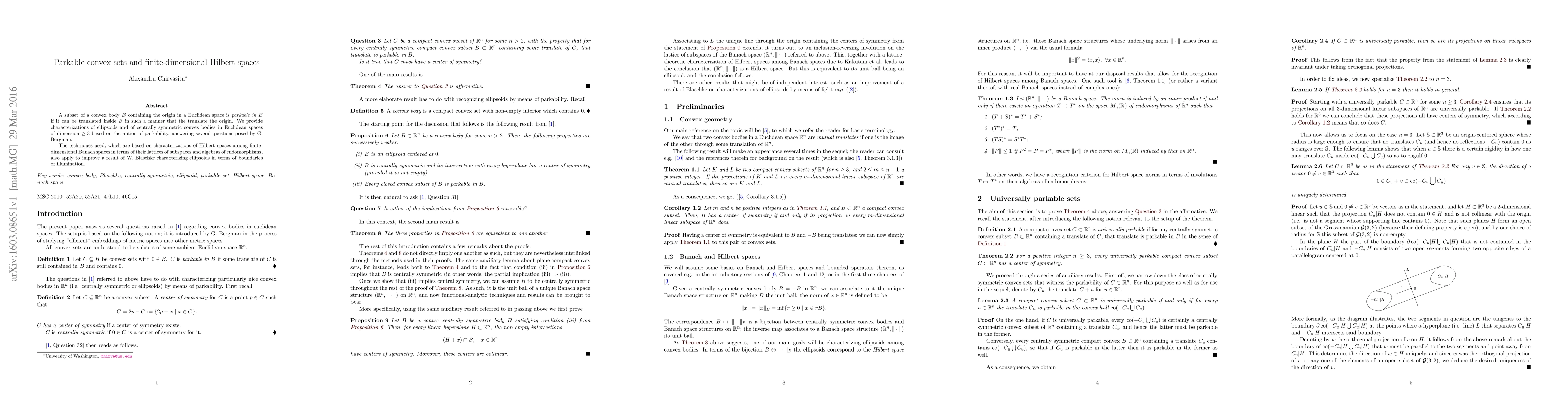A subset of a convex body $B$ containing the origin in a Euclidean space is {\it parkable in $B$} if it can be translated inside $B$ in such a manner that the translate the origin. We provide characterizations of ellipsoids and of centrally symmetric convex bodies in Euclidean spaces of dimension $\ge 3$ based on the notion of parkability, answering several questions posed by G. Bergman. The techniques used, which are based on characterizations of Hilbert spaces among finite-dimensional Banach spaces in terms of their lattices of subspaces and algebras of endomorphisms, also apply to improve a result of W. Blaschke characterizing ellipsoids in terms of boundaries of illumination.