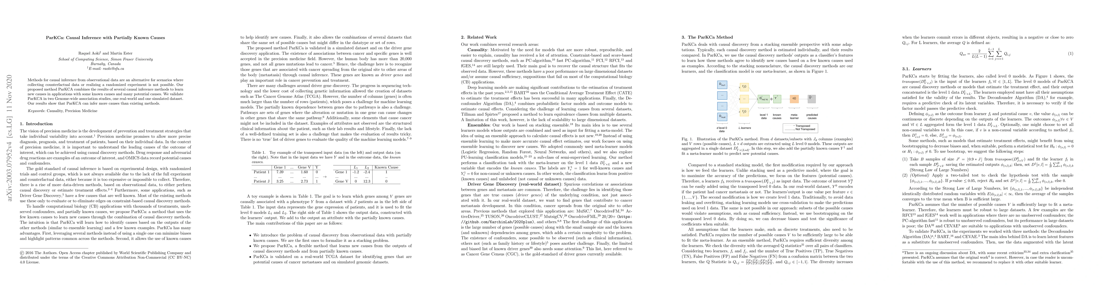 Methods for causal inference from observational data are an alternative for scenarios where collecting counterfactual data or realizing a randomized experiment is not possible. Adopting a stacking approach, our proposed method ParKCA combines the results of several causal inference methods to learn new causes in applications with some known causes and many potential causes. We validate ParKCA in two Genome-wide association studies, one real-world and one simulated dataset. Our results show that ParKCA can infer more causes than existing methods.