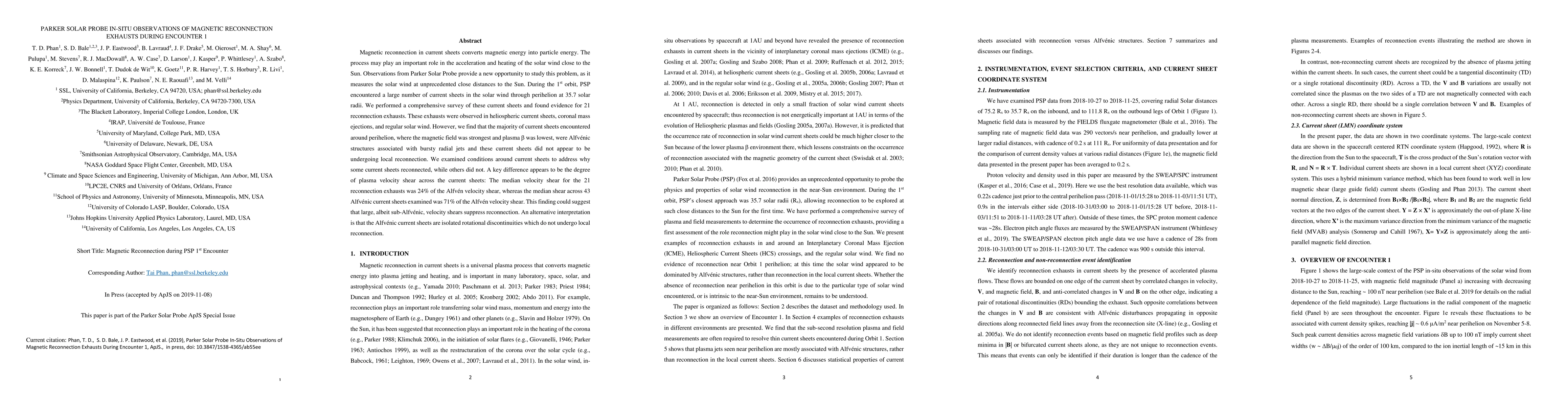 Parker Solar Probe's observations during its first orbit reveal 21 reconnection exhausts in various solar wind structures, indicating magnetic reconnection's role in solar wind acceleration. Notably, Alfv\'enic current sheets near perihelion, characterized by strong magnetic fields and low plasma beta, did not exhibit local reconnection, suggesting that large velocity shears may suppress reconnection.