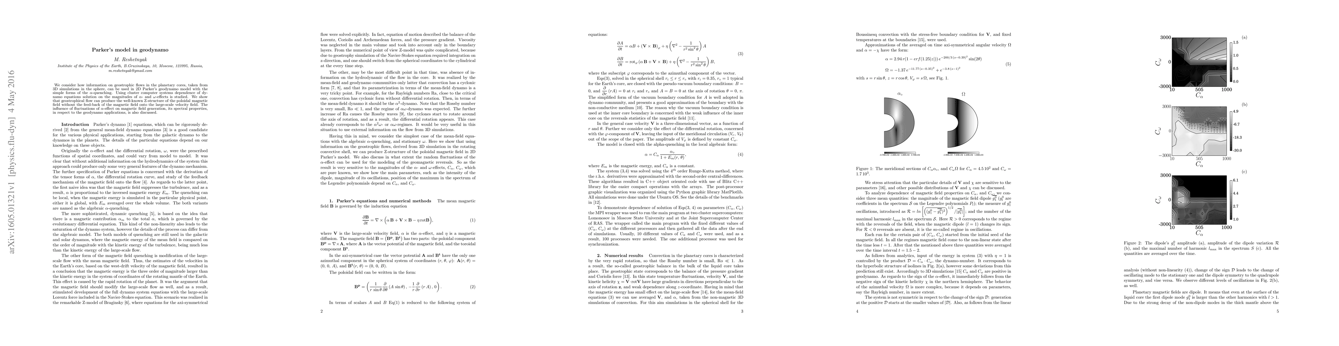 The paper explores the application of Parker's geodynamo model using 3D geostrophic flow simulations from planetary cores. It demonstrates that geostrophic flow can generate the Z-structure of the poloidal magnetic field without magnetic field feedback on large-scale velocity. The study also investigates the influence of $alpha$-effect fluctuations on magnetic field generation and its spectral properties for geodynamo applications, using cluster computer systems to analyze the dependence of dynamo equations on $alpha$- and $omega$-effects.
