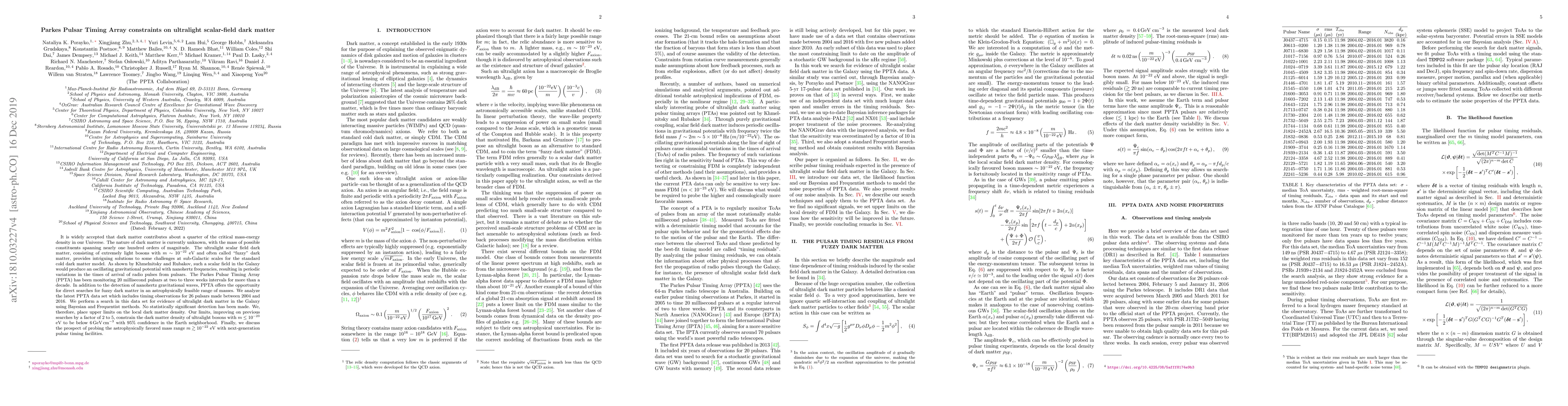 The Parkes Pulsar Timing Array (PPTA) analyzed data from 26 pulsars to search for ultralight scalar-field dark matter, which could manifest as oscillating gravitational potentials. No significant detections were made, leading to improved upper limits on the local density of ultralight dark matter bosons, constraining it to below 6 GeV cm$^{-3}$ with 95% confidence.