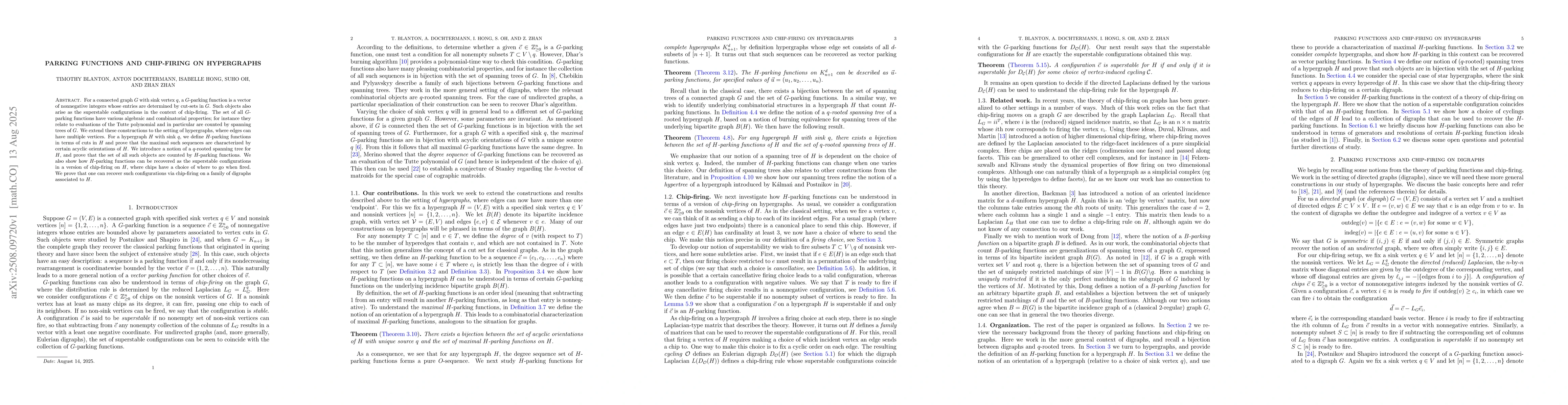 The paper extends the concept of parking functions and chip-firing from graphs to hypergraphs, defining H-parking functions and establishing their properties and connections to spanning trees and superstable configurations in a chip-firing process on hypergraphs.
