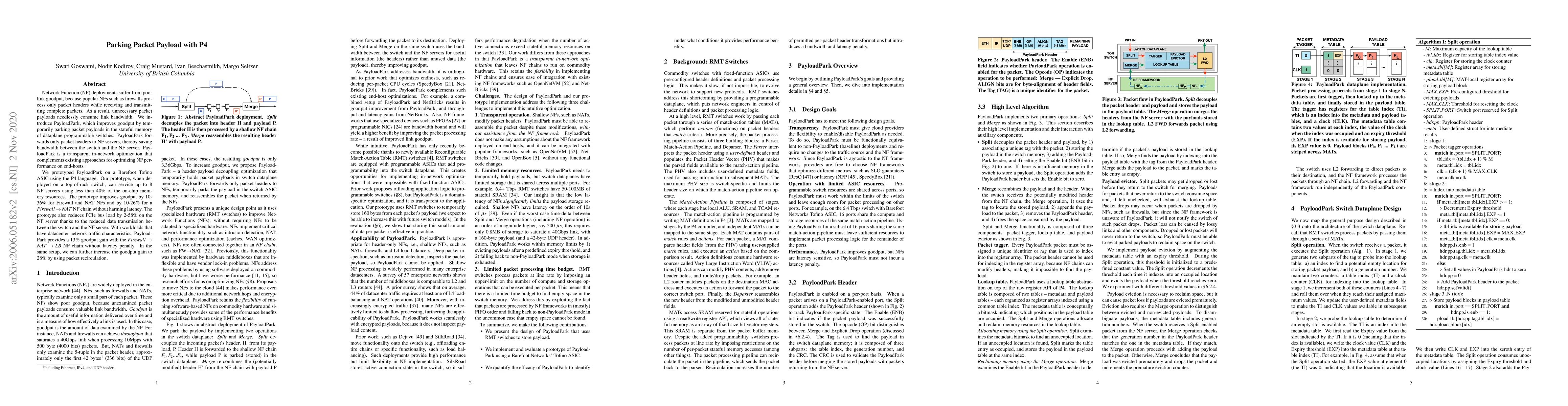The PayloadPark system optimizes network function deployments by temporarily parking packet payloads in dataplane switches, forwarding only headers to NF servers to reduce bandwidth consumption. The P4-based prototype on Barefoot Tofino ASIC improves goodput by 10-36% for standalone NFs and up to 28% for chained NFs, while maintaining low latency and reducing PCIe bus load.