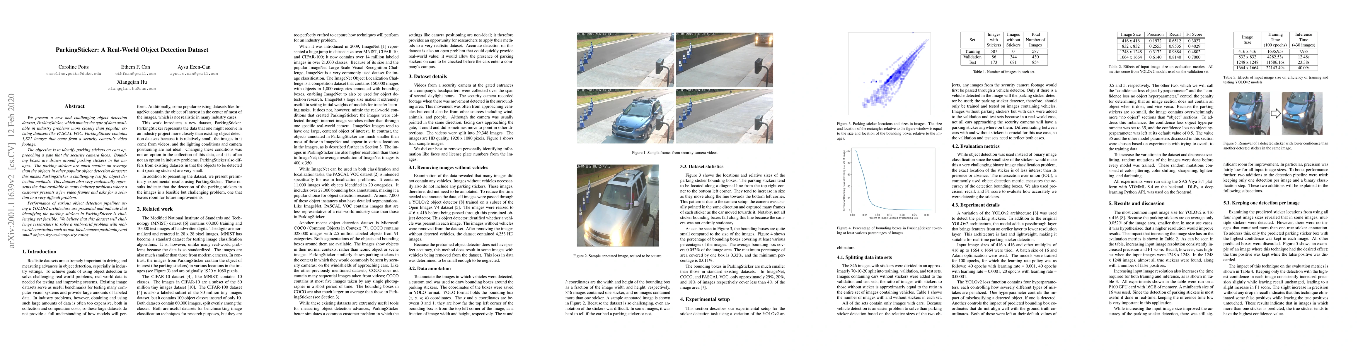The ParkingSticker dataset presents 1,871 images from security camera footage to identify small parking stickers on cars, offering a realistic challenge for object detection methods. It demonstrates the difficulty of detecting small objects in real-world scenarios, with YOLOv2 showing feasible but challenging performance.