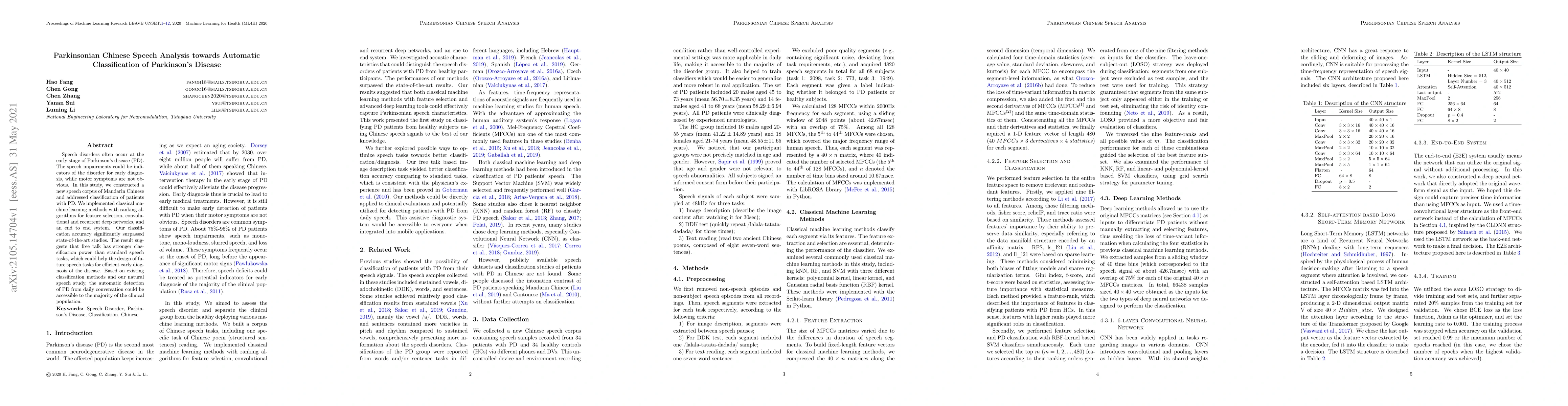 Speech disorders often occur at the early stage of Parkinson's disease (PD). The speech impairments could be indicators of the disorder for early diagnosis, while motor symptoms are not obvious. In this study, we constructed a new speech corpus of Mandarin Chinese and addressed classification of patients with PD. We implemented classical machine learning methods with ranking algorithms for feature selection, convolutional and recurrent deep networks, and an end to end system. Our classification accuracy significantly surpassed state-of-the-art studies. The result suggests that free talk has stronger classification power than standard speech tasks, which could help the design of future speech tasks for efficient early diagnosis of the disease. Based on existing classification methods and our natural speech study, the automatic detection of PD from daily conversation could be accessible to the majority of the clinical population.
