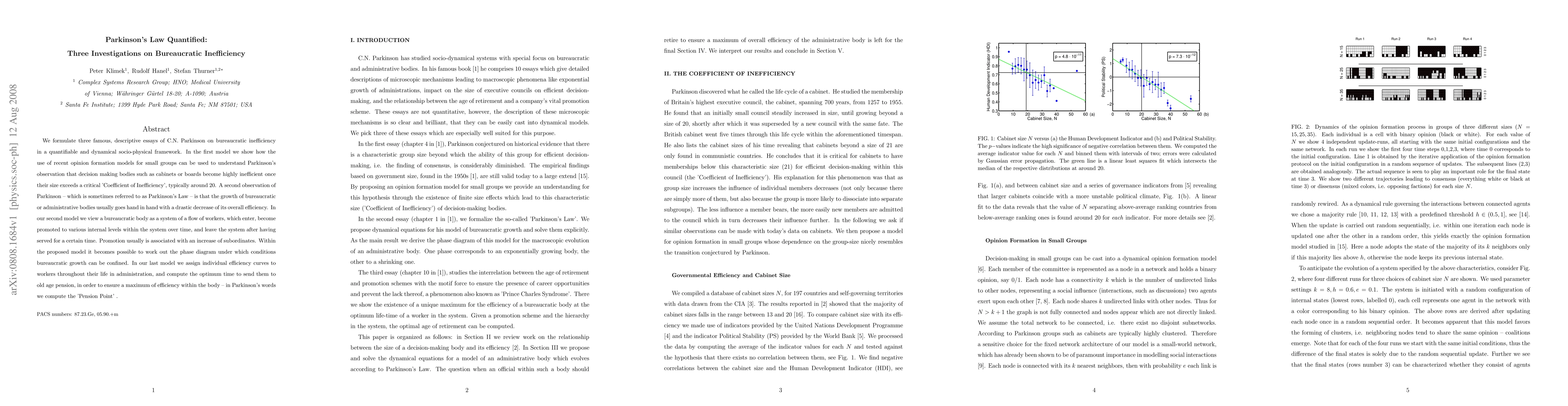 This research quantifies C.N. Parkinson's observations on bureaucratic inefficiency. Using models based on opinion formation and worker flow, it explains how decision-making bodies become inefficient with size (Coefficient of Inefficiency around 20) and how bureaucratic growth decreases efficiency. It also determines the 'Pension Point' for maximum administrative efficiency.