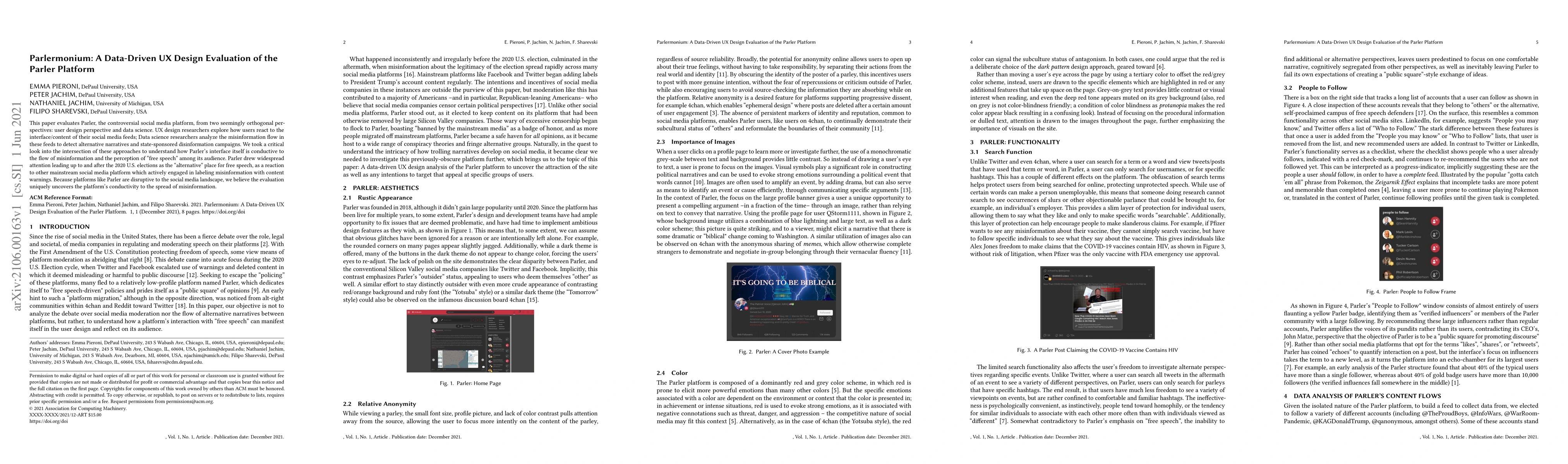 This paper evaluates Parler, the controversial social media platform, from two seemingly orthogonal perspectives: UX design perspective and data science. UX design researchers explore how users react to the interface/content of their social media feeds; Data science researchers analyze the misinformation flow in these feeds to detect alternative narratives and state-sponsored disinformation campaigns. We took a critical look into the intersection of these approaches to understand how Parler's interface itself is conductive to the flow of misinformation and the perception of "free speech" among its audience. Parler drew widespread attention leading up to and after the 2020 U.S. elections as the "alternative" place for free speech, as a reaction to other mainstream social media platform which actively engaged in labeling misinformation with content warnings. Because platforms like Parler are disruptive to the social media landscape, we believe the evaluation uniquely uncovers the platform's conductivity to the spread of misinformation.