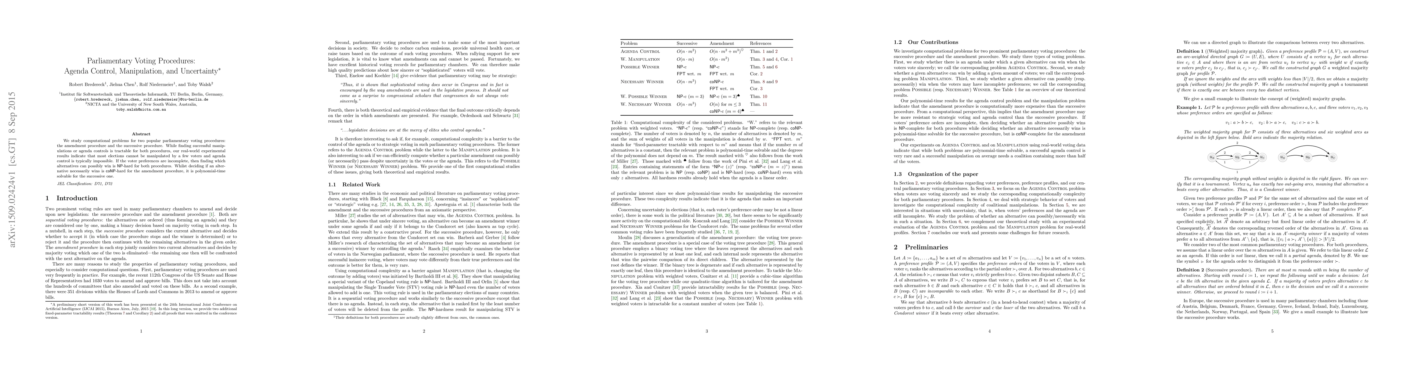 We study computational problems for two popular parliamentary voting procedures: the amendment procedure and the successive procedure. While finding successful manipulations or agenda controls is tractable for both procedures, our real-world experimental results indicate that most elections cannot be manipulated by a few voters and agenda control is typically impossible. If the voter preferences are incomplete, then finding which alternatives can possibly win is NP-hard for both procedures. Whilst deciding if an alternative necessarily wins is coNP-hard for the amendment procedure, it is polynomial-time solvable for the successive one.