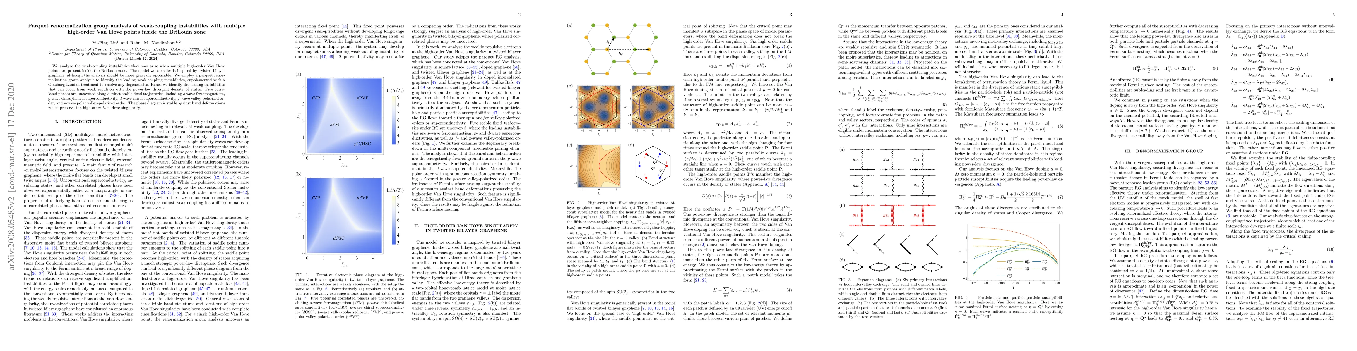 We analyze the weak-coupling instabilities that may arise when multiple high-order Van Hove points are present inside the Brillouin zone. The model we consider is inspired by twisted bilayer graphene, although the analysis should be more generally applicable. We employ a parquet renormalization group analysis to identify the leading weak-coupling instabilities, supplemented with a Ginzburg-Landau treatment to resolve any degeneracies. Hence we identify the leading instabilities that can occur from weak repulsion with the power-law divergent density of states. Five correlated phases are uncovered along distinct stable fixed trajectories, including $s$-wave ferromagnetism, $p$-wave chiral/helical superconductivity, $d$-wave chiral superconductivity, $f$-wave valley-polarized order, and $p$-wave polar valley-polarized order. The phase diagram is stable against band deformations which preserve the high-order Van Hove singularity.
