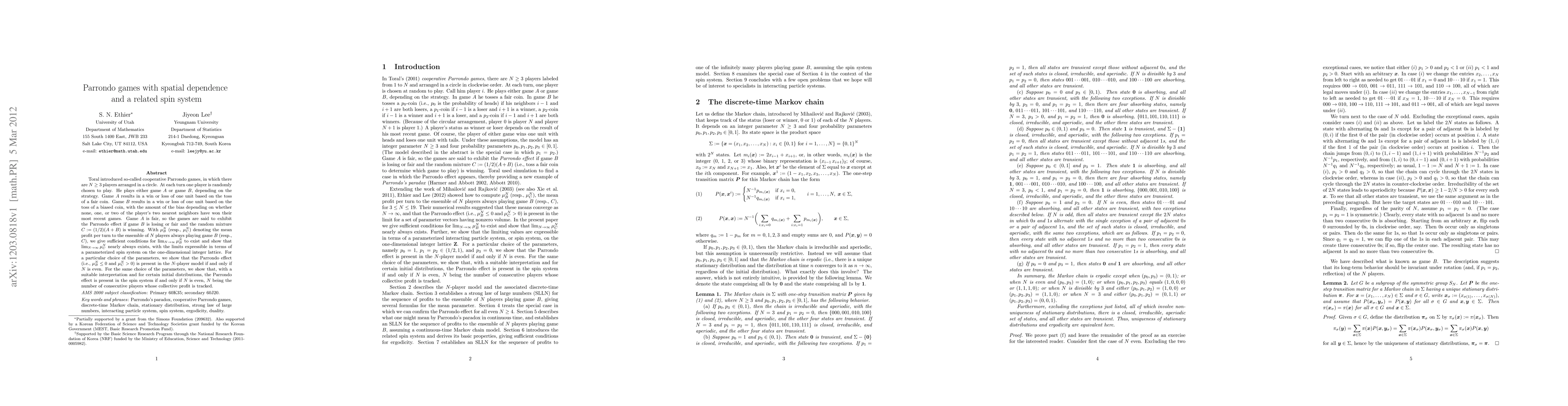 Toral introduced so-called cooperative Parrondo games, in which there are N players (3 or more) arranged in a circle. At each turn one player is randomly chosen to play. He plays either game A or game B, depending on the strategy. Game A results in a win or loss of one unit based on the toss of a fair coin. Game B results in a win or loss of one unit based on the toss of a biased coin, with the amount of the bias depending on whether none, one, or two of the player's two nearest neighbors have won their most recent games. Game A is fair, so the games are said to exhibit the Parrondo effect if game B is losing or fair and the random mixture C:=(1/2)(A+B) is winning. With mu_B (resp., mu_C) denoting the mean profit per turn to the ensemble of N players always playing game B (resp., C), we give sufficient conditions for lim mu_B (as N goes to infinity) to exist and show that lim mu_C nearly always exists, with the limits expressible in terms of a parameterized spin system on the one-dimensional integer lattice. For a particular choice of the parameters, we show that the Parrondo effect (i.e., mu_B is nonpositive and mu_C is positive) is present in the N-player model if and only if N is even. For the same choice of the parameters, we show that, with a suitable interpretation and for certain initial distributions, the Parrondo effect is present in the spin system if and only if N is even, N being the number of consecutive players whose collective profit is tracked.