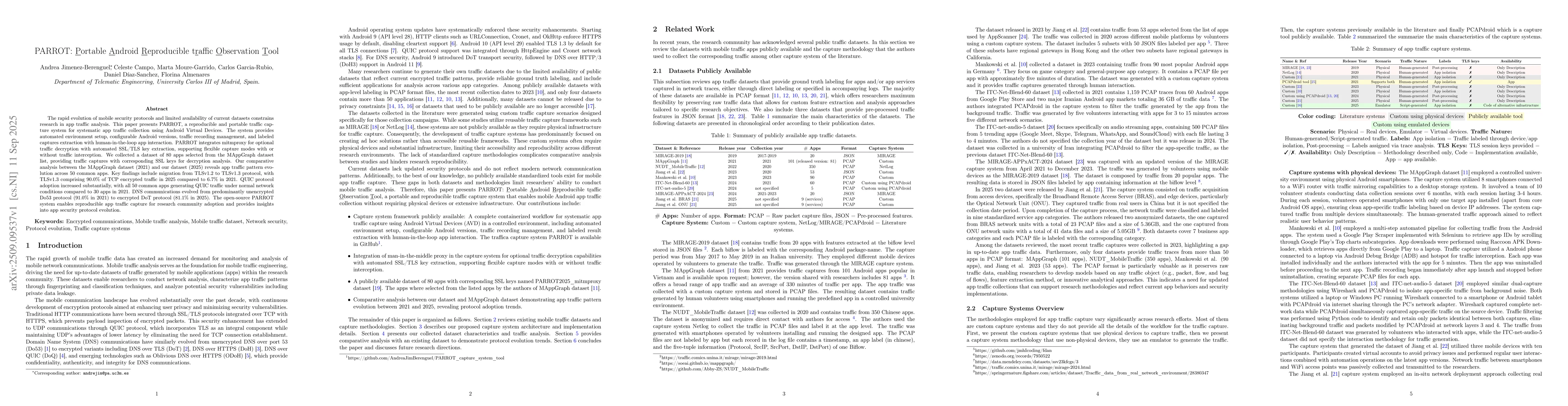 The rapid evolution of mobile security protocols and limited availability of current datasets constrains research in app traffic analysis. This paper presents PARROT, a reproducible and portable traffic capture system for systematic app traffic collection using Android Virtual Devices. The system provides automated environment setup, configurable Android versions, traffic recording management, and labeled captures extraction with human-in-the-loop app interaction. PARROT integrates mitmproxy for optional traffic decryption with automated SSL/TLS key extraction, supporting flexible capture modes with or without traffic interception. We collected a dataset of 80 apps selected from the MAppGraph dataset list, providing traffic captures with corresponding SSL keys for decryption analysis. Our comparative analysis between the MAppGraph dataset (2021) and our dataset (2025) reveals app traffic pattern evolution across 50 common apps. Key findings include migration from TLSv1.2 to TLSv1.3 protocol, with TLSv1.3 comprising 90.0\% of TCP encrypted traffic in 2025 compared to 6.7\% in 2021. QUIC protocol adoption increased substantially, with all 50 common apps generating QUIC traffic under normal network conditions compared to 30 apps in 2021. DNS communications evolved from predominantly unencrypted Do53 protocol (91.0\% in 2021) to encrypted DoT protocol (81.1\% in 2025). The open-source PARROT system enables reproducible app traffic capture for research community adoption and provides insights into app security protocol evolution.