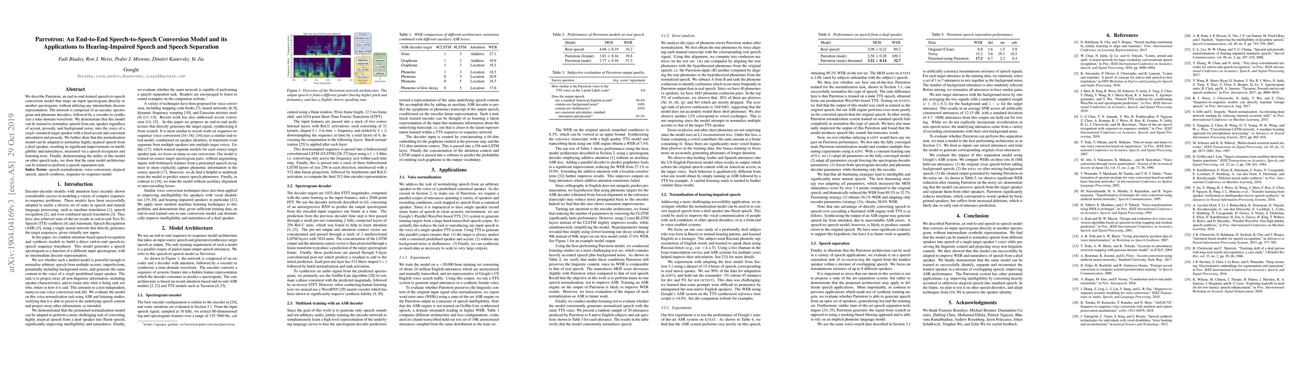 Parrotron is an end-to-end speech-to-speech conversion model that directly maps input spectrograms to target spectrograms, enabling speech normalization and separation. It significantly improves intelligibility and naturalness for hearing-impaired speech and can also perform speech separation tasks.