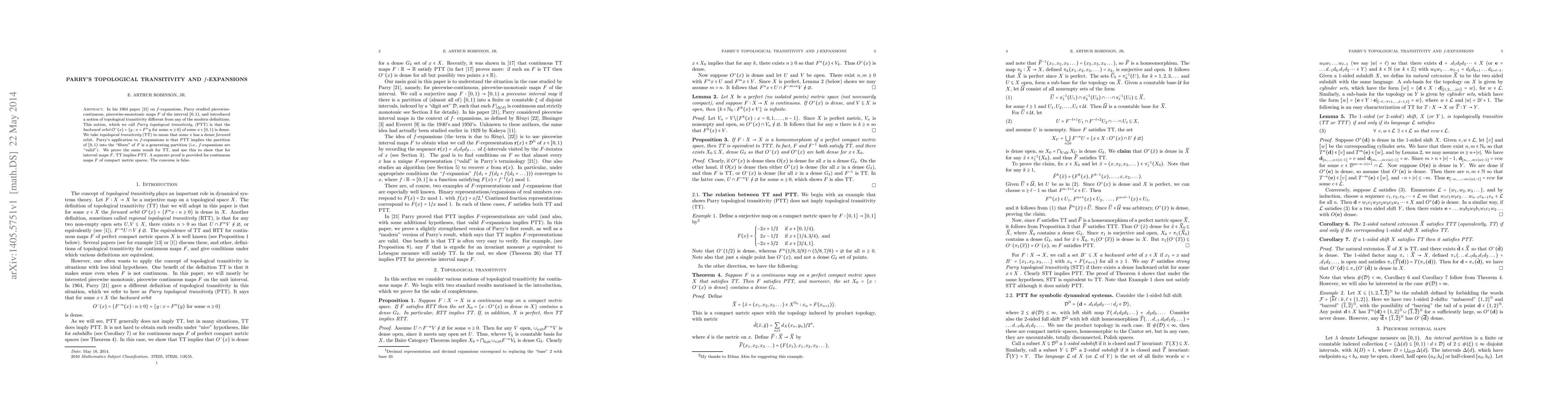 The paper analyzes Parry's topological transitivity (PTT) in the context of f-expansions for piecewise interval maps (PIMs). It extends Parry's original theorem to mixed-type PIMs and establishes a connection between topological transitivity (TT) and PTT.