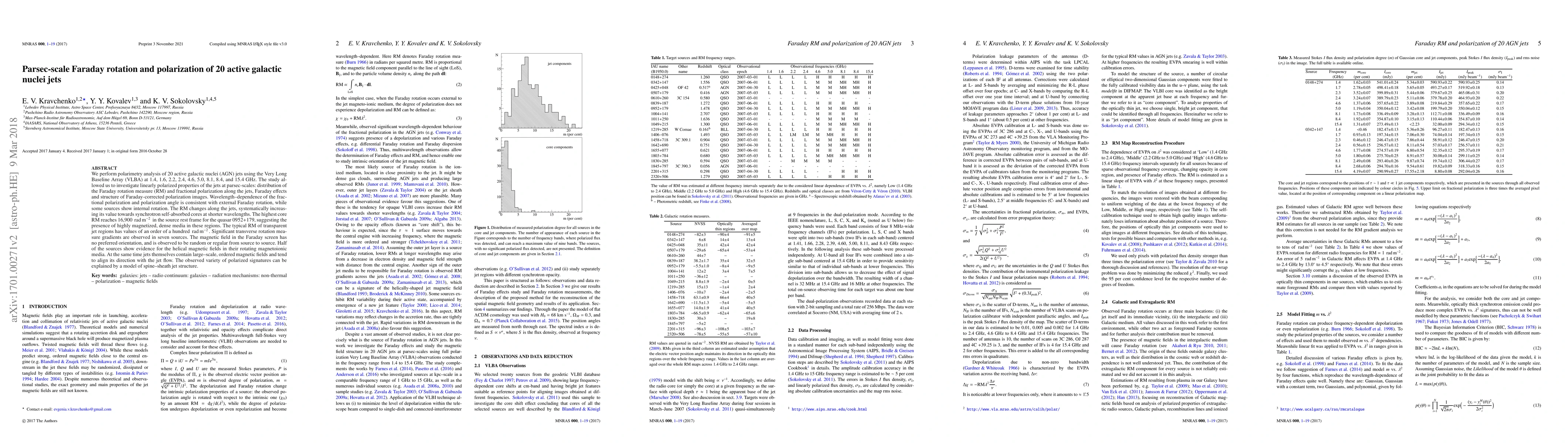 This study uses VLBA polarimetry to analyze the Faraday rotation and polarization of 20 AGN jets, revealing diverse magnetic field structures and the presence of helical magnetic fields in some sources. The findings suggest a spine-sheath jet model to explain the observed polarized signatures.