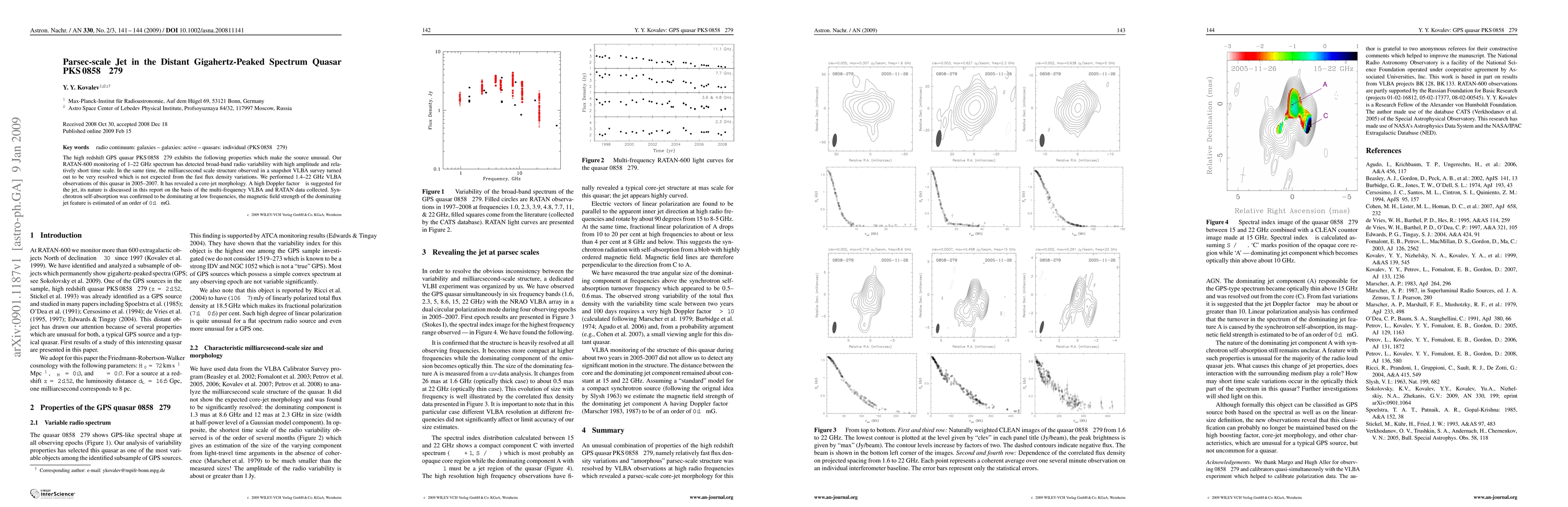 A study of quasar PKS 0858-279 reveals a broad-band radio variability with high amplitude, a core-jet morphology, and a strong magnetic field in its jet feature.