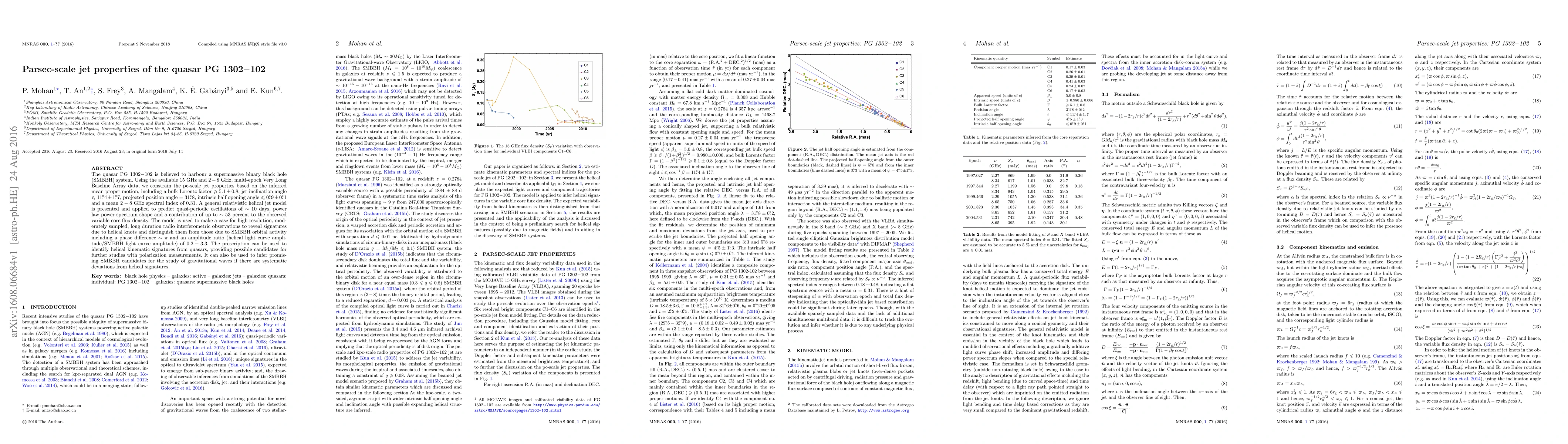 The quasar PG 1302$-$102 is believed to harbour a supermassive binary black hole (SMBBH) system. Using the available 15 GHz and $2-8$ GHz, multi-epoch Very Long Baseline Array data, we constrain the pc-scale jet properties based on the inferred mean proper motion, including a bulk Lorentz factor $\geq 5.1 \pm 0.8$, jet inclination angle $\leq (11.4 \pm 1.7)$ degrees, projected position angle $= 31.8$ degrees, intrinsic half opening angle $\leq (0.9 \pm 0.1)$ degrees and a mean $2-8$ GHz spectral index of 0.31. A general relativistic helical jet model is presented and applied to predict quasi-periodic oscillations of $\sim$ 10 days, power law power spectrum shape and a contribution of up to $\sim$ 53 percent to the observed variable core flux density. The model is used to make a case for high resolution, moderately sampled, long duration radio interferometric observations to reveal signatures due to helical knots and distinguish them from those due to SMBBH orbital activity including a phase difference $\sim \pi$ and an amplitude ratio (helical light curve amplitude/SMBBH light curve amplitude) of $0.2-3.3$. The prescription can be used to identify helical kinematic signatures from quasars, providing possible candidates for further studies with polarization measurements. It can also be used to infer promising SMBBH candidates for the study of gravitational waves if there are systematic deviations from helical signatures.