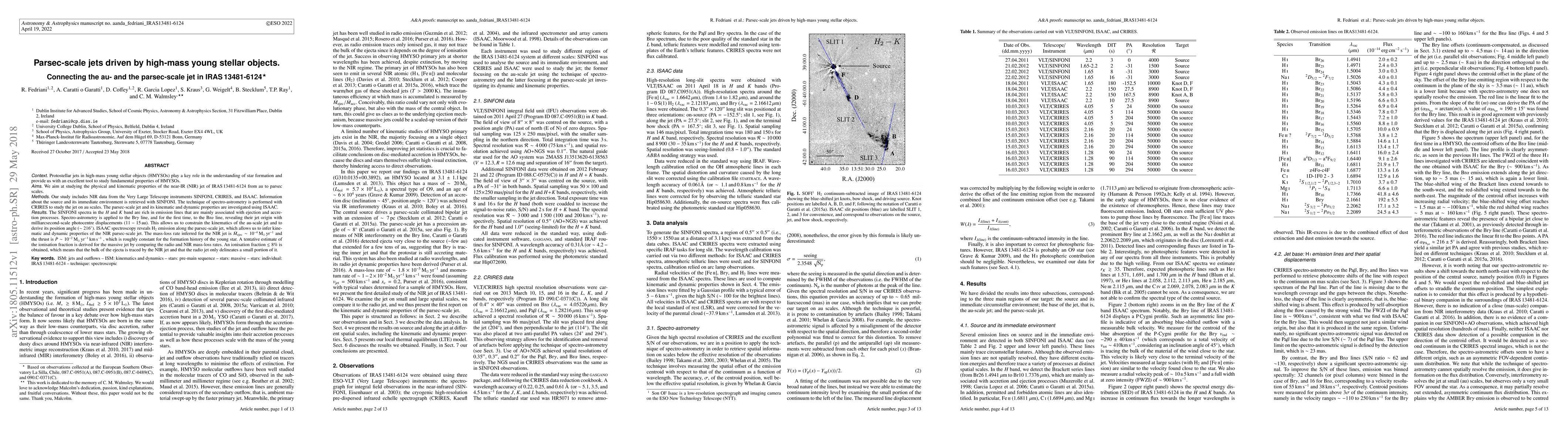 Context: Protostellar jets in high-mass young stellar objects (HMYSOs) play a key role in the understanding of star formation and provide us with an excellent tool to study fundamental properties of HMYSOs. Aims: We aim at studying the physical and kinematic properties of the near-IR (NIR) jet of IRAS\,13481-6124 from au to parsec scales. Methods: Our study includes NIR data from the Very Large Telescope instruments SINFONI, CRIRES, and ISAAC. Information about the source and its immediate environment is retrieved with SINFONI. The technique of spectro-astrometry is performed with CRIRES to study the jet on au scales. The parsec-scale jet and its kinematic and dynamic properties are investigated using ISAAC. Results: The SINFONI spectra in the $H$ and $K$ band are rich in emission lines that are mainly associated with ejection and accretion processes. Spectro-astrometry is applied to the Br$\gamma$ line, and for the first time, to the Br$\alpha$ line, revealing their jet origin with milliarcsecond-scale photocentre displacements ($11-15$\,au). This allows us to constrain the kinematics of the au-scale jet and to derive its position angle ($\sim216^{\circ}$). ISAAC spectroscopy reveals H$_2$ emission along the parsec-scale jet, which allows us to infer kinematic and dynamic properties of the NIR parsec-scale jet. The mass-loss rate inferred for the NIR jet is $\dot{M}_\mathrm{ejec}\sim10^{-4}\mathrm{\,M_\odot\,yr^{-1}}$ and the thrust is $\dot{P}\sim10^{-2}\mathrm{\,M_\odot\,yr^{-1}\,km\,s^{-1}}$ , which is roughly constant for the formation history of the young star. A tentative estimate of the ionisation fraction is derived for the massive jet by comparing the radio and NIR mass-loss rates. An ionisation fraction $\lesssim8\%$ is obtained, which means that the bulk of the ejecta is traced by the NIR jet and that the radio jet only delineates a small portion of it.
