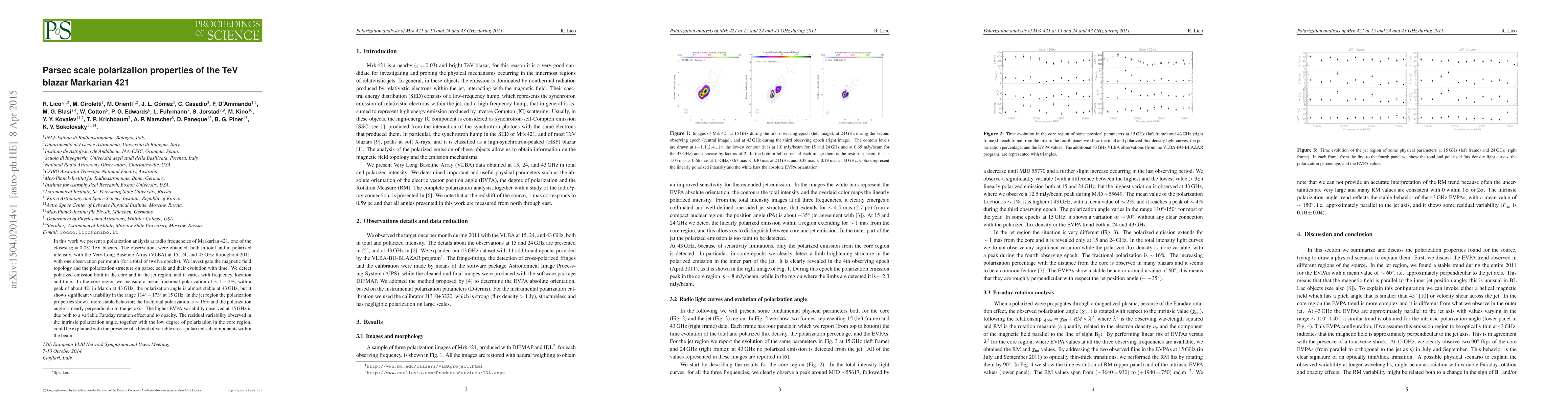 Researchers studied polarization properties of Markarian 421, a TeV blazar, using radio frequencies, finding variable polarization in the core and jet regions with distinct characteristics at different frequencies and locations.