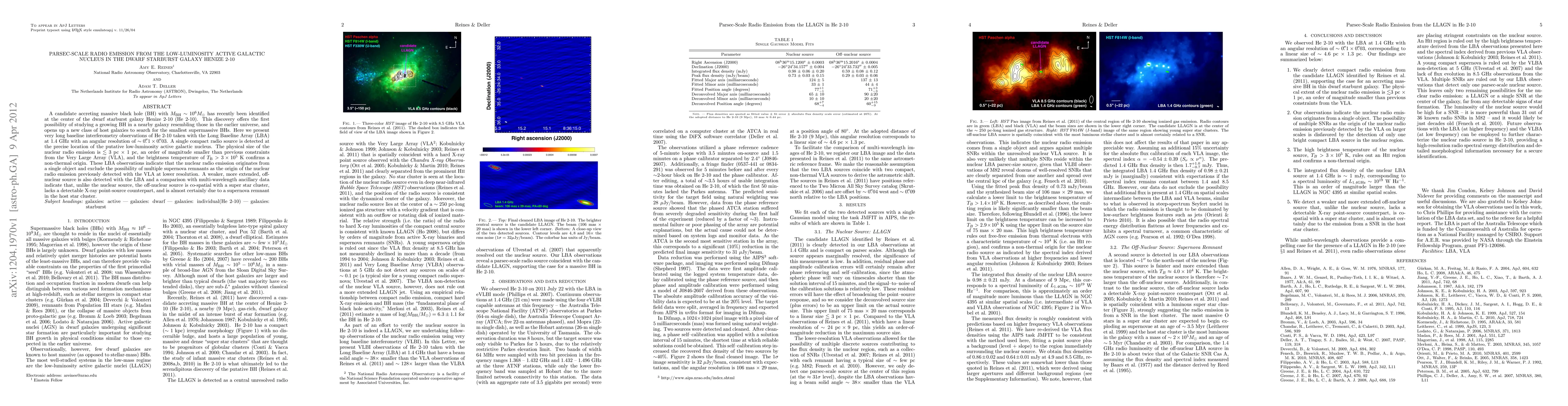 The research presents VLBI observations of the dwarf starburst galaxy Henize 2-10, revealing a compact radio source at its center, indicating a low-luminosity active galactic nucleus (AGN) with a massive black hole (~10^6 Msun). The high brightness temperature confirms non-thermal emission, ruling out supernova remnants as the origin. A separate, extended radio source is identified as a supernova remnant associated with a star cluster.