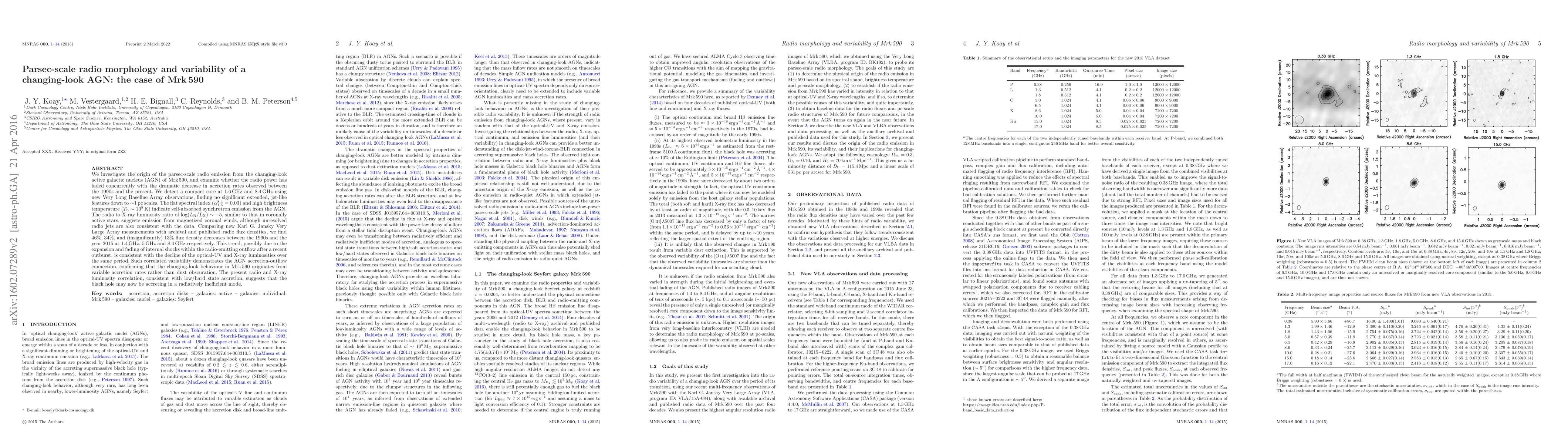 This study investigates the parsec-scale radio morphology and variability of the changing-look AGN Mrk 590, revealing a compact core with no extended jet features and a declining radio power correlating with reduced accretion rates. The findings suggest the variability is due to changes in accretion rather than dust obscuration.