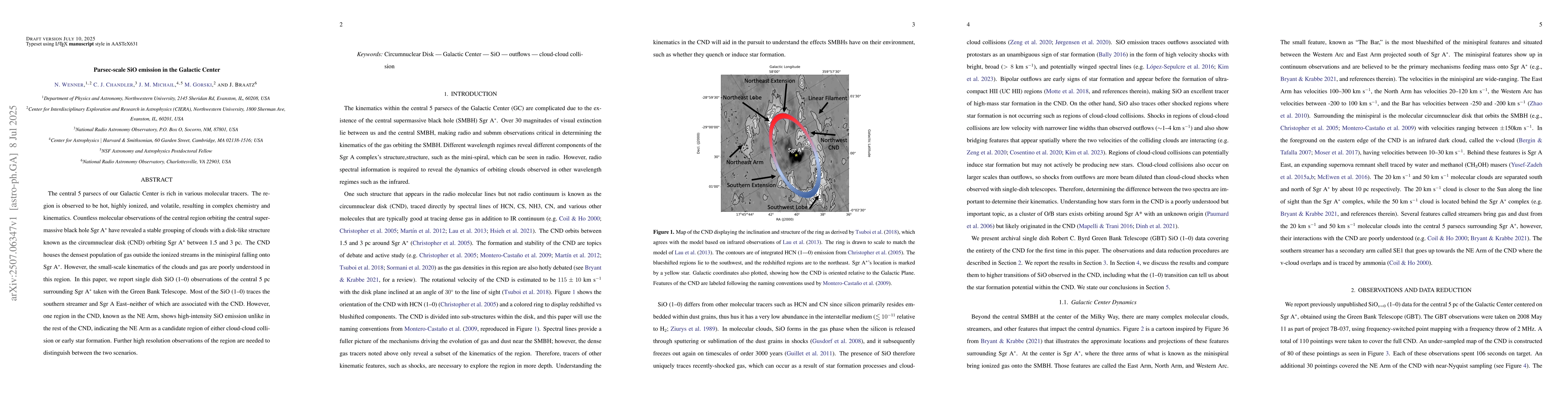 The study uses Green Bank Telescope SiO (1-0) observations to examine the central 5 pc around the Galactic Center's super-massive black hole Sgr A*. Most SiO emission originates from the southern streamer and Sgr A East, not the Circumnuclear Disk (CND). However, the NE Arm of the CND displays high-intensity SiO, suggesting either cloud-cloud collision or early star formation, requiring further high-resolution observations for confirmation.