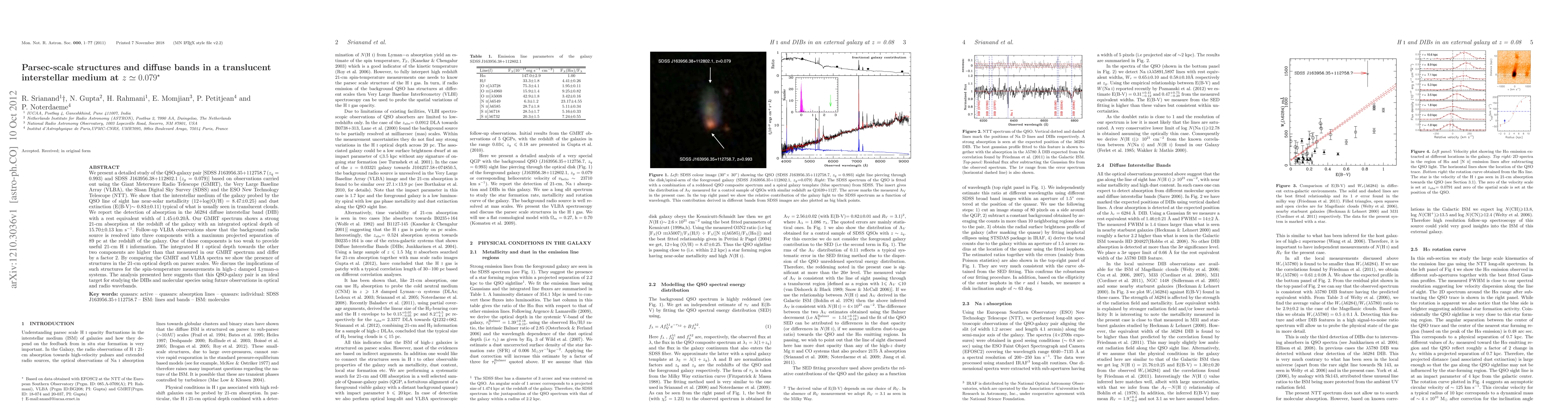 We present a detailed study of the QSO-galaxy pair [SDSS J163956.35+112758.7 (zq = 0.993) and SDSS J163956.38+112802.1 (zg = 0.079)] based on observations carried out using the Giant Meterwave Radio Telescope (GMRT), the Very Large Baseline Array (VLBA), the Sloan Digital Sky Survey (SDSS) and the ESO New Technology Telescope (NTT). We show that the interstellar medium of the galaxy probed by the QSO line of sight has near-solar metallicity (12+log(O/H) = 8.47+/-0.25) and dust extinction (E(B-V) 0.83+/-0.11) typical of what is usually seen in translucent clouds. We report the detection of absorption in the \lambda 6284 diffuse interstellar band (DIB) with a rest equivalent width of 1.45+/-0.20\AA. Our GMRT spectrum shows a strong 21-cm absorption at the redshift of the galaxy with an integrated optical depth of 15.70+/-0.13 km/s. Follow-up VLBA observations show that the background radio source is resolved into three components with a maximum projected separation of 89 pc at the redshift of the galaxy. One of these components is too weak to provide useful HI 21-cm absorption information. The integrated HI optical depth towards the other two components are higher than that measured in our GMRT spectrum and differ by a factor 2. By comparing the GMRT and VLBA spectra we show the presence of structures in the 21-cm optical depth on parsec scales. We discuss the implications of such structures for the spin-temperature measurements in high-z damped Lyman-alpha systems. The analysis presented here suggests that this QSO-galaxy pair is an ideal target for studying the DIBs and molecular species using future observations in optical and radio wavebands.