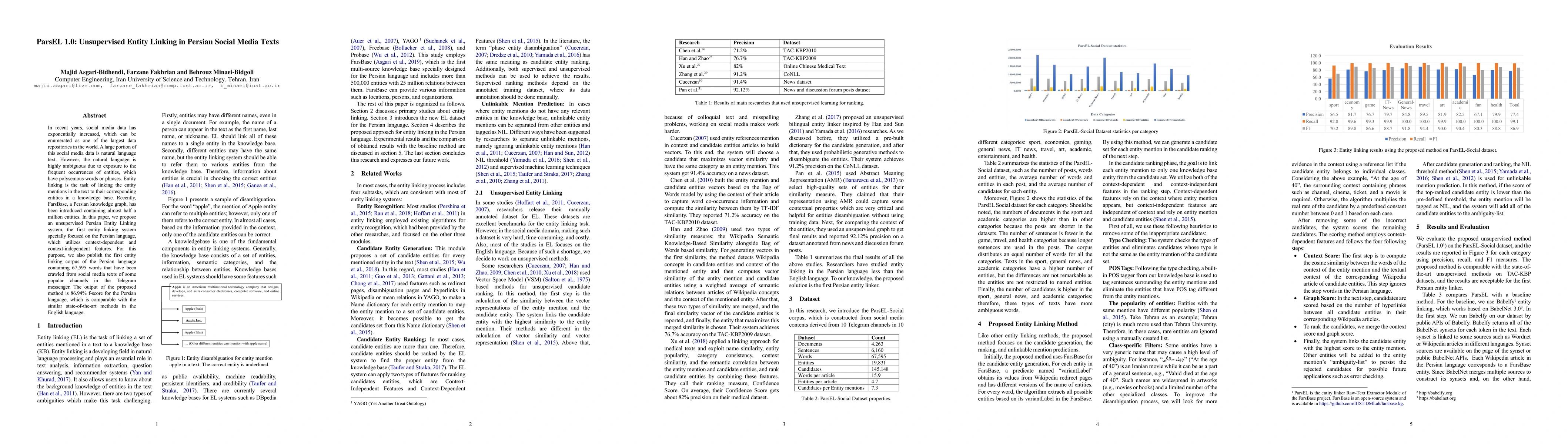 This paper introduces ParsEL 1.0, an unsupervised Persian Entity Linking system designed for social media text, leveraging both context-dependent and context-independent features. It also presents the first Persian entity linking corpus, achieving an 86.94% f-score, comparable to state-of-the-art English methods.