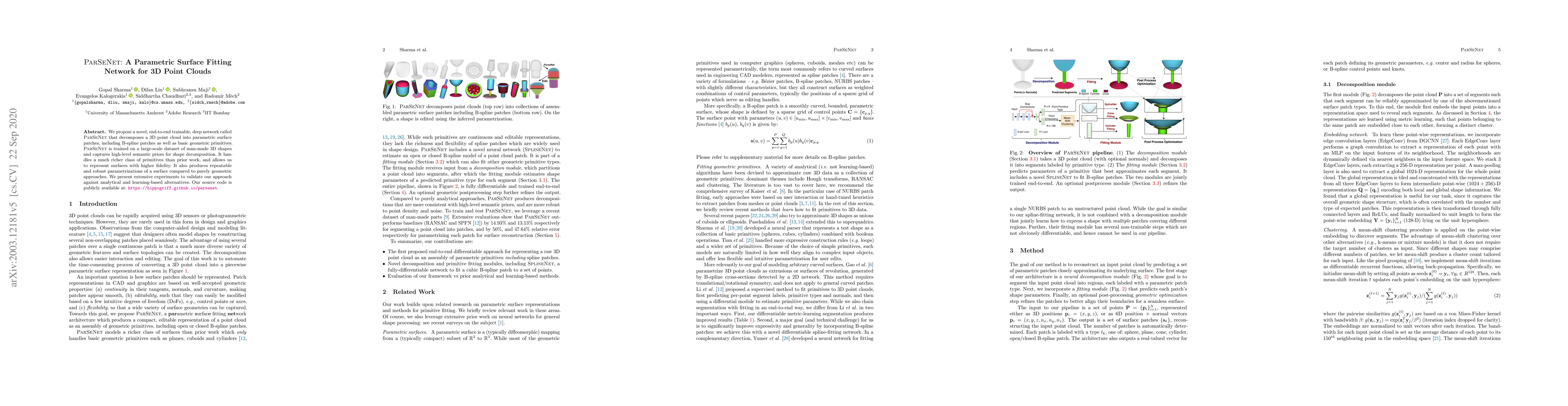 ParSeNet is a deep learning network designed to decompose 3D point clouds into parametric surface patches, including B-spline patches and geometric primitives. It captures high-level semantic priors and represents surfaces with higher fidelity compared to purely geometric methods.