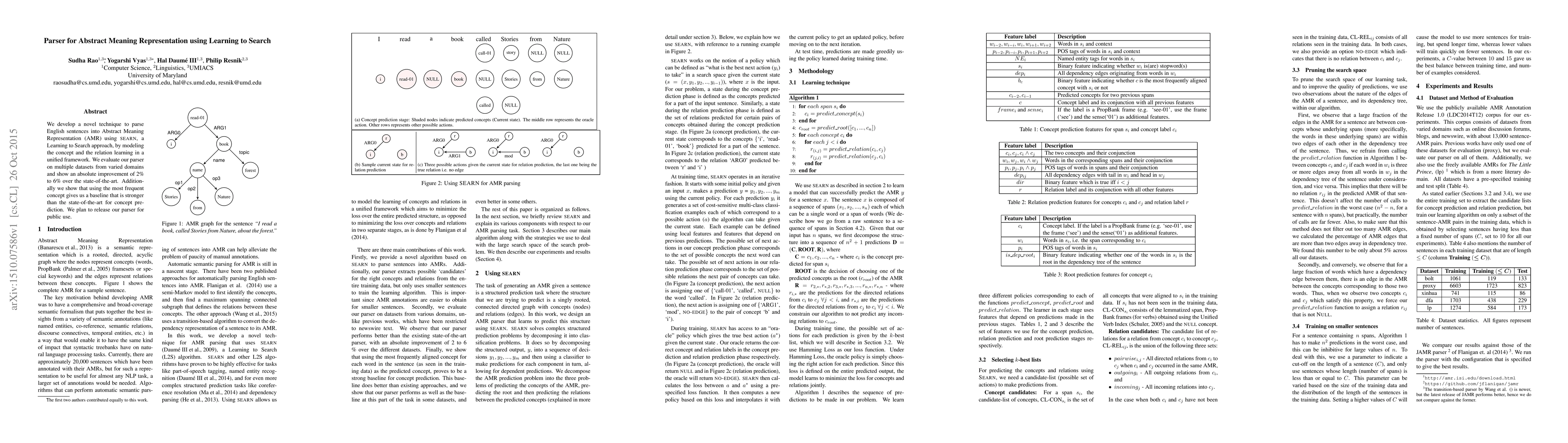 This paper introduces a new parser that translates English sentences into Abstract Meaning Representation (AMR) using SEARN, a learning to search method. The parser achieves a 2% to 6% improvement over existing techniques and plans to be made publicly available.