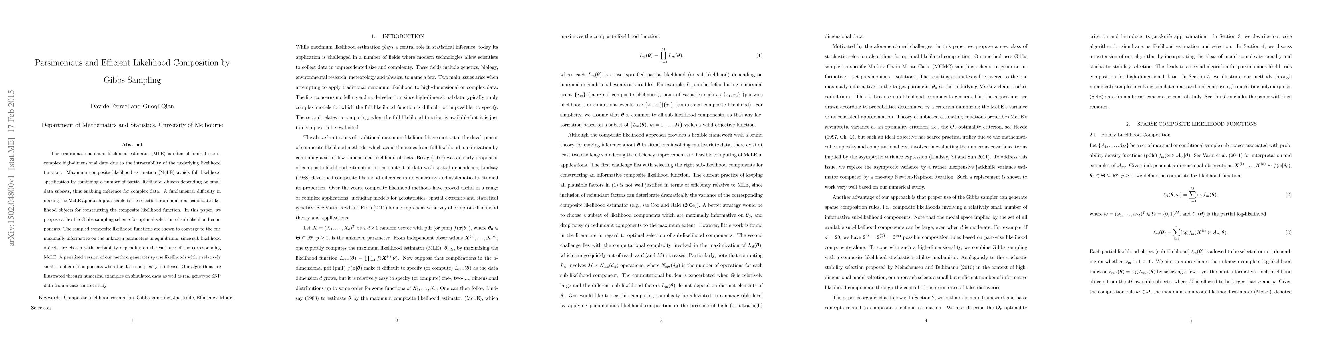 The traditional maximum likelihood estimator (MLE) is often of limited use in complex high-dimensional data due to the intractability of the underlying likelihood function. Maximum composite likelihood estimation (McLE) avoids full likelihood specification by combining a number of partial likelihood objects depending on small data subsets, thus enabling inference for complex data. A fundamental difficulty in making the McLE approach practicable is the selection from numerous candidate likelihood objects for constructing the composite likelihood function. In this paper, we propose a flexible Gibbs sampling scheme for optimal selection of sub-likelihood components. The sampled composite likelihood functions are shown to converge to the one maximally informative on the unknown parameters in equilibrium, since sub-likelihood objects are chosen with probability depending on the variance of the corresponding McLE. A penalized version of our method generates sparse likelihoods with a relatively small number of components when the data complexity is intense. Our algorithms are illustrated through numerical examples on simulated data as well as real genotype SNP data from a case-control study.