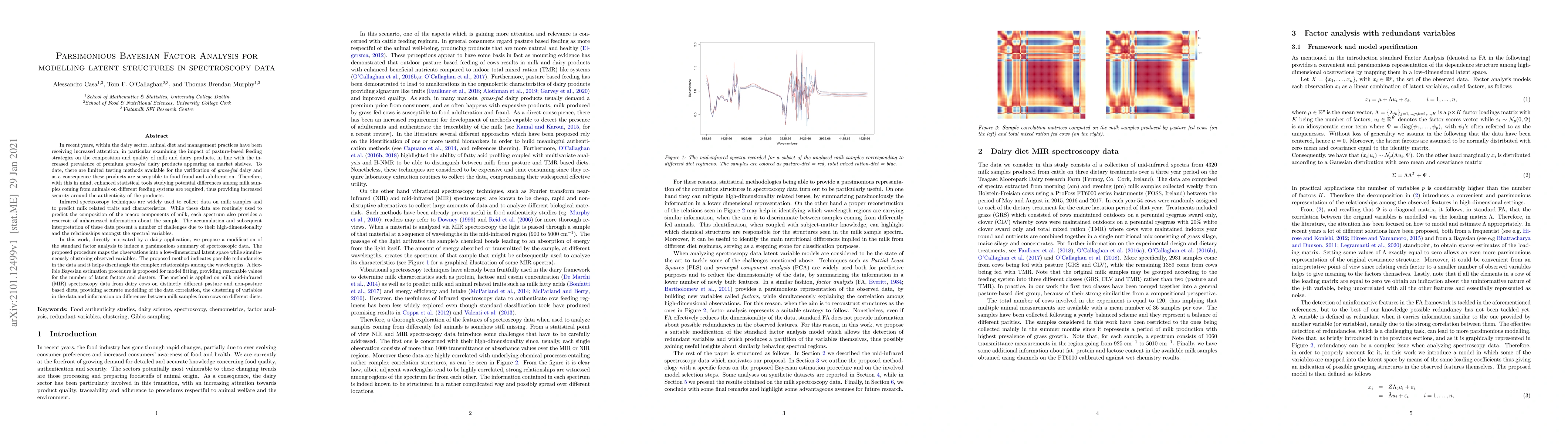 In recent years animal diet has been receiving increased attention, in particular examining the impact of pasture-based feeding strategies on the quality of milk and dairy products, in line with the increased prevalence of grass-fed dairy products appearing on market shelves. To date, there are limited testing methods available for the verification of grass-fed dairy therefore these products are susceptible to food fraud and adulteration. Hence statistical tools studying potential differences among milk samples coming from animals on different feeding systems are required, thus providing increased security around the authenticity of the products. Infrared spectroscopy techniques are widely used to collect data on milk samples and to predict milk related traits. While these data are routinely used to predict the composition of the macro components of milk, each spectrum provides a reservoir of unharnessed information about the sample. The interpretation of these data presents a number of challenges due to their high-dimensionality and the relationships amongst the spectral variables. In this work we propose a modification of the standard factor analysis to induce a parsimonious summary of spectroscopic data. The procedure maps the observations into a low-dimensional latent space while simultaneously clustering observed variables. The method indicates possible redundancies in the data and it helps disentangle the complex relationships among the wavelengths. A flexible Bayesian estimation procedure is proposed for model fitting, providing reasonable values for the number of latent factors and clusters. The method is applied on milk mid-infrared spectroscopy data from dairy cows on different pasture and non-pasture based diets, providing accurate modelling of the data correlation, the clustering of variables and information on differences between milk samples from cows on different diets.
