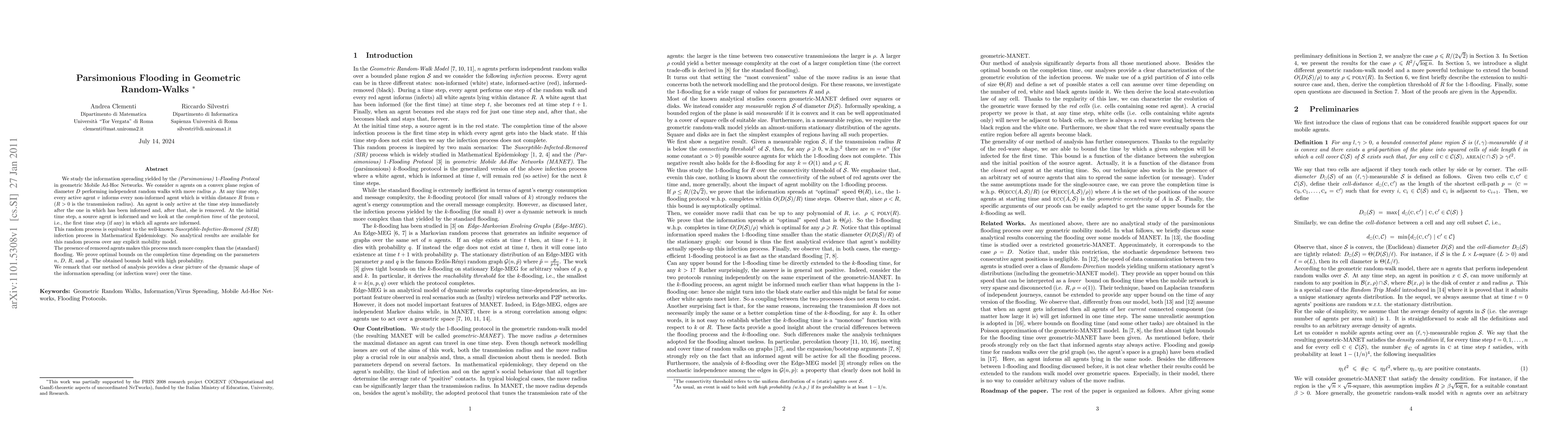 We study the information spreading yielded by the \emph{(Parsimonious) $1$-Flooding Protocol} in geometric Mobile Ad-Hoc Networks. We consider $n$ agents on a convex plane region of diameter $D$ performing independent random walks with move radius $\rho$. At any time step, every active agent $v$ informs every non-informed agent which is within distance $R$ from $v$ ($R>0$ is the transmission radius). An agent is only active at the time step immediately after the one in which has been informed and, after that, she is removed. At the initial time step, a source agent is informed and we look at the \emph{completion time} of the protocol, i.e., the first time step (if any) in which all agents are informed. This random process is equivalent to the well-known \emph{Susceptible-Infective-Removed ($SIR$}) infection process in Mathematical Epidemiology. No analytical results are available for this random process over any explicit mobility model. The presence of removed agents makes this process much more complex than the (standard) flooding. We prove optimal bounds on the completion time depending on the parameters $n$, $D$, $R$, and $\rho$. The obtained bounds hold with high probability. We remark that our method of analysis provides a clear picture of the dynamic shape of the information spreading (or infection wave) over the time.