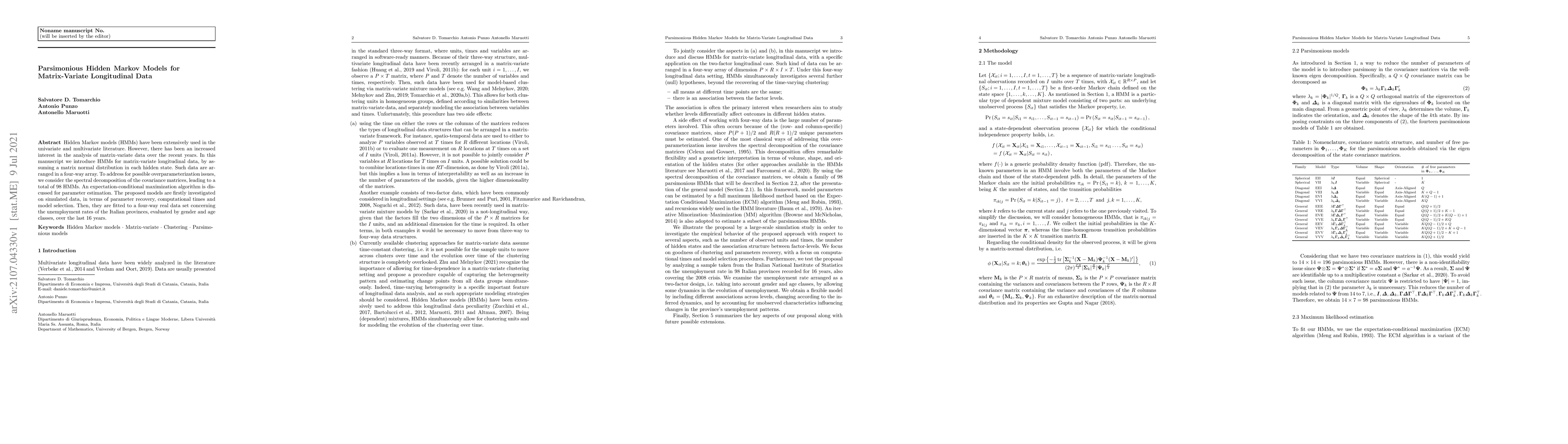 This paper introduces parsimonious Hidden Markov Models (HMMs) for analyzing matrix-variate longitudinal data, employing matrix normal distributions and spectral decomposition to address overparameterization. The models are evaluated on simulated data and applied to real data on Italian unemployment rates, demonstrating parameter recovery and model selection.