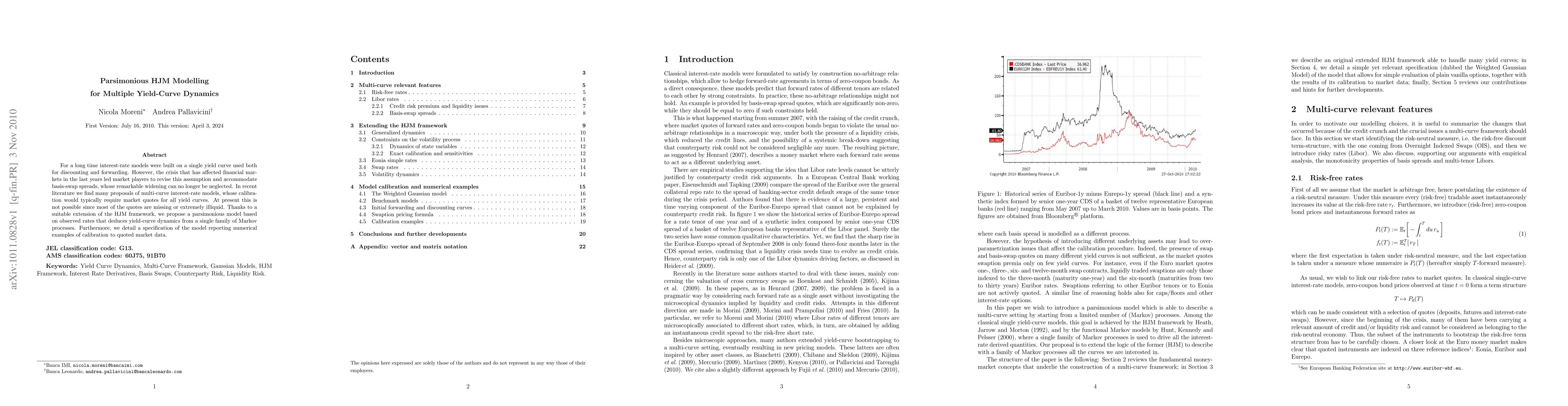 This paper proposes a parsimonious Heath-Jarrow-Morton (HJM) model for multiple yield-curve dynamics, addressing the need to incorporate basis-swap spreads. It introduces a model that deduces yield-curve dynamics from a single family of Markov processes, enabling calibration using observed rates despite missing or illiquid market quotes.
