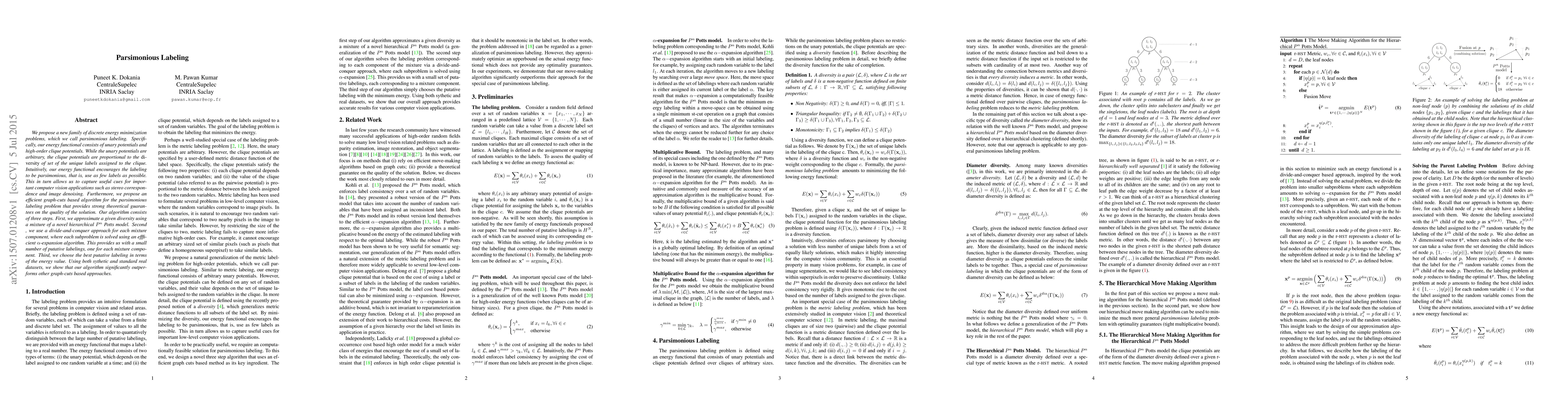 This paper introduces a new energy minimization problem called parsimonious labeling that encourages using few labels in computer vision tasks, presenting an efficient algorithm with strong theoretical guarantees.