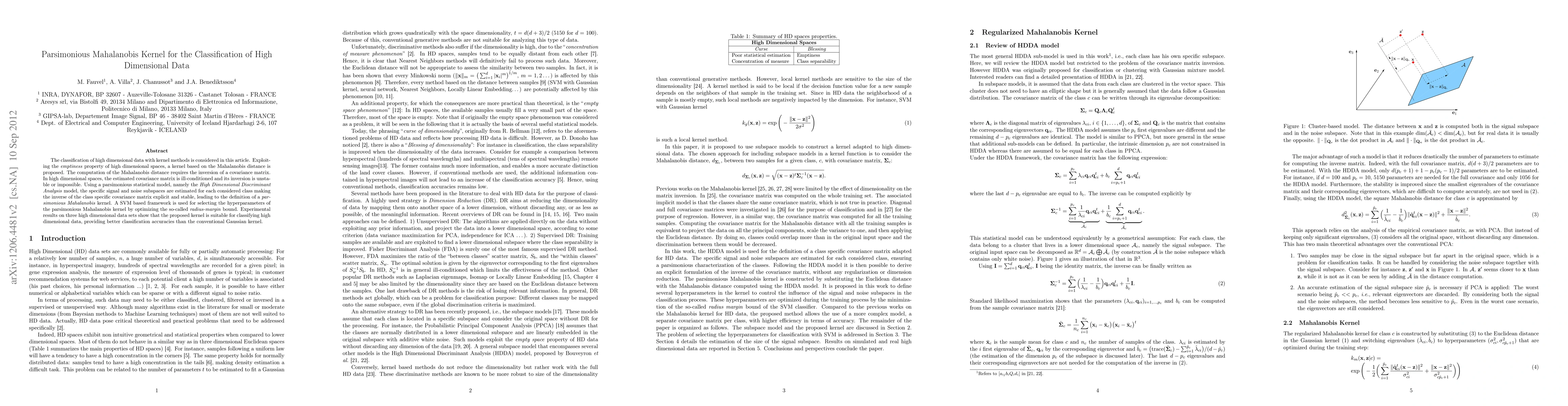This paper proposes a parsimonious Mahalanobis kernel for classifying high dimensional data, leveraging High Dimensional Discriminant Analysis to stabilize the inversion of ill-conditioned covariance matrices. Experimental results show improved classification accuracy over conventional Gaussian kernels.