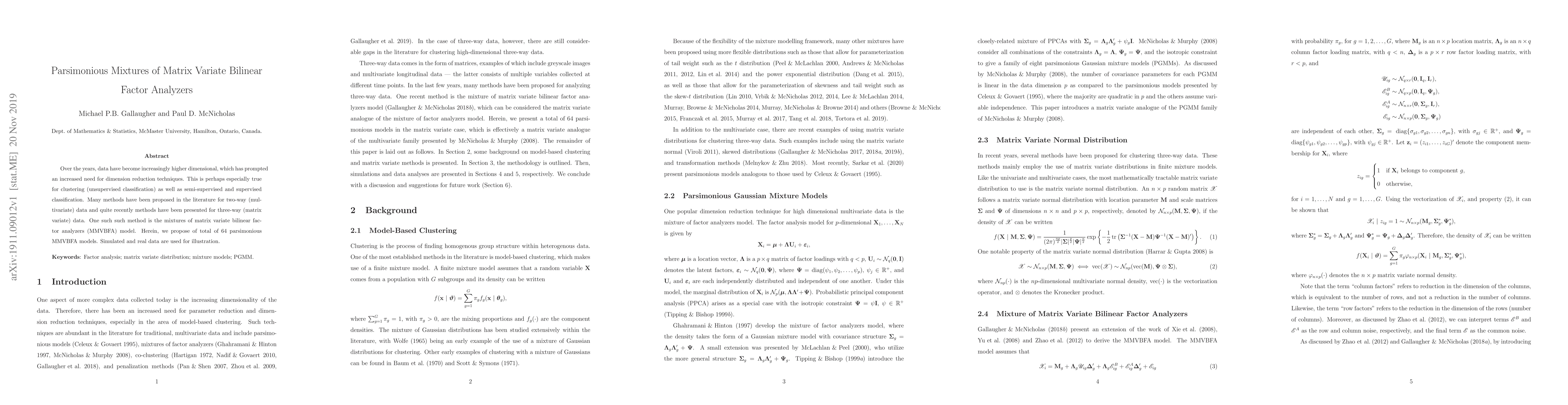 This paper proposes 64 parsimonious mixtures of matrix variate bilinear factor analyzers (MMVBFA) models to address the need for dimension reduction in high-dimensional data, particularly for clustering and classification tasks. These models are demonstrated using both simulated and real data.