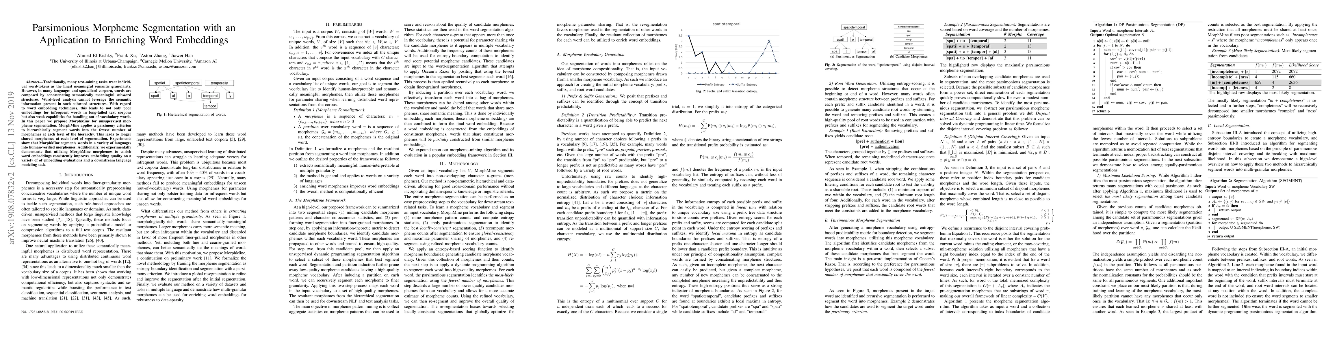 Traditionally, many text-mining tasks treat individual word-tokens as the finest meaningful semantic granularity. However, in many languages and specialized corpora, words are composed by concatenating semantically meaningful subword structures. Word-level analysis cannot leverage the semantic information present in such subword structures. With regard to word embedding techniques, this leads to not only poor embeddings for infrequent words in long-tailed text corpora but also weak capabilities for handling out-of-vocabulary words. In this paper we propose MorphMine for unsupervised morpheme segmentation. MorphMine applies a parsimony criterion to hierarchically segment words into the fewest number of morphemes at each level of the hierarchy. This leads to longer shared morphemes at each level of segmentation. Experiments show that MorphMine segments words in a variety of languages into human-verified morphemes. Additionally, we experimentally demonstrate that utilizing MorphMine morphemes to enrich word embeddings consistently improves embedding quality on a variety of of embedding evaluations and a downstream language modeling task.
