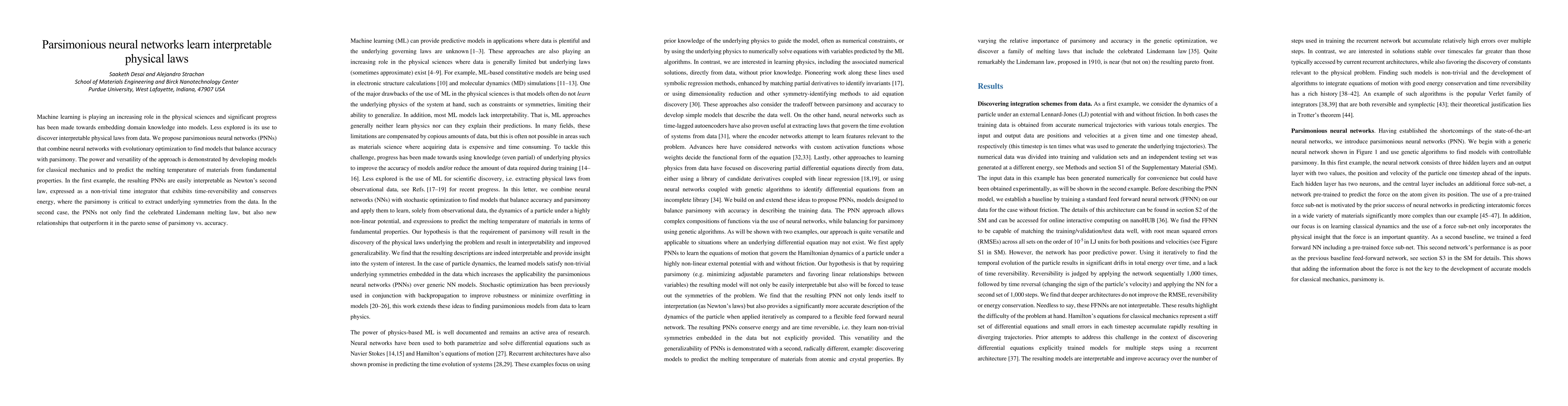 Researchers developed a new approach to learn interpretable physical laws from data using parsimonious neural networks that balance accuracy with simplicity. These models were successfully applied to classical mechanics and material melting temperatures, outperforming existing laws in some cases.