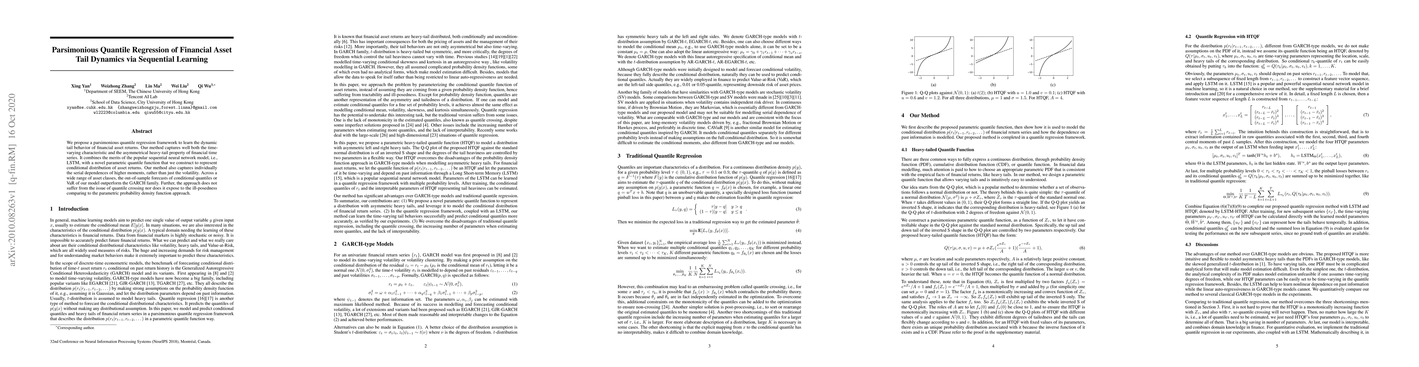 We propose a parsimonious quantile regression framework to learn the dynamic tail behaviors of financial asset returns. Our model captures well both the time-varying characteristic and the asymmetrical heavy-tail property of financial time series. It combines the merits of a popular sequential neural network model, i.e., LSTM, with a novel parametric quantile function that we construct to represent the conditional distribution of asset returns. Our model also captures individually the serial dependences of higher moments, rather than just the volatility. Across a wide range of asset classes, the out-of-sample forecasts of conditional quantiles or VaR of our model outperform the GARCH family. Further, the proposed approach does not suffer from the issue of quantile crossing, nor does it expose to the ill-posedness comparing to the parametric probability density function approach.