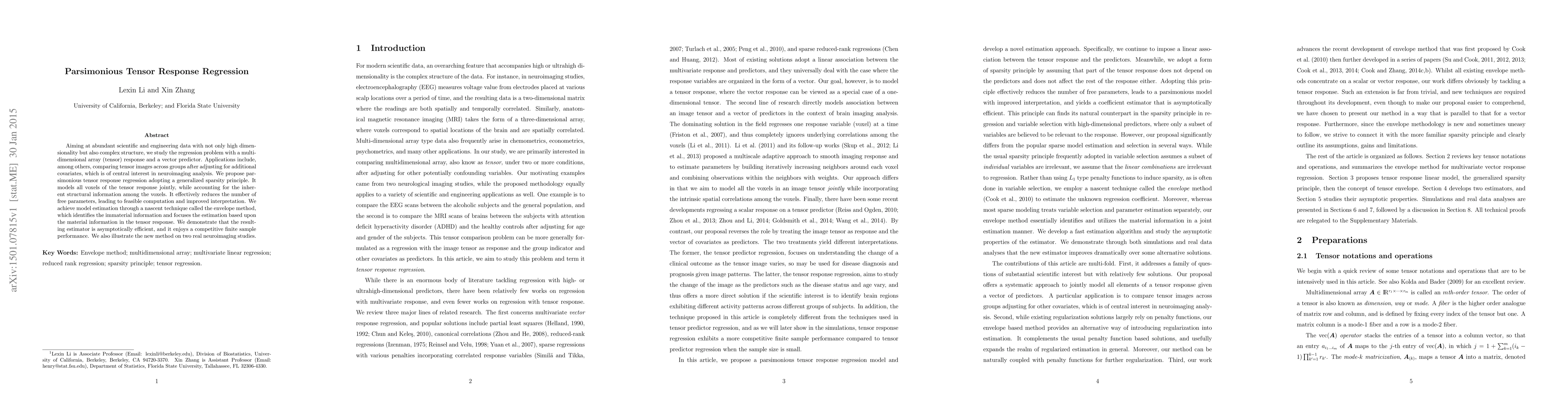 This paper proposes a parsimonious tensor response regression method to handle high-dimensional and structurally complex data, particularly in neuroimaging. It employs a generalized sparsity principle to jointly model tensor responses while accounting for voxel structure, reducing parameters for feasible computation and improved interpretation.