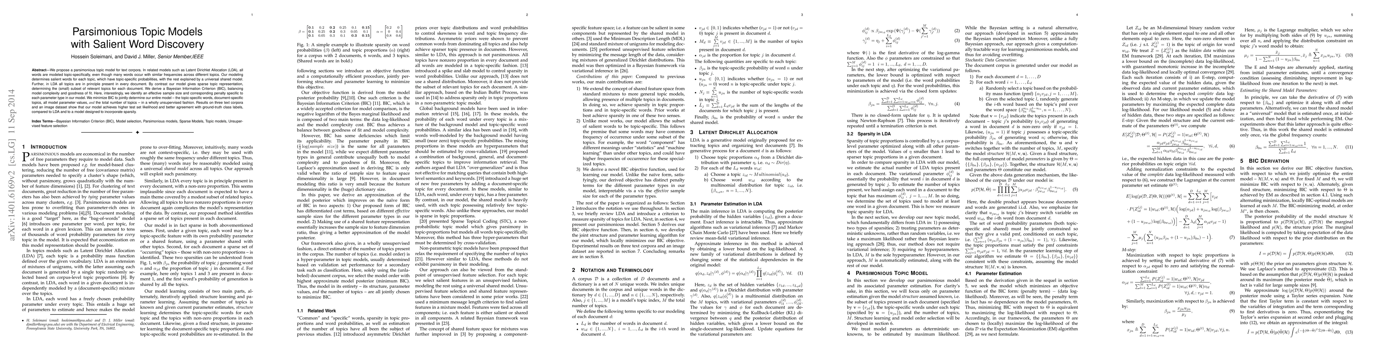 We propose a parsimonious topic model for text corpora. In related models such as Latent Dirichlet Allocation (LDA), all words are modeled topic-specifically, even though many words occur with similar frequencies across different topics. Our modeling determines salient words for each topic, which have topic-specific probabilities, with the rest explained by a universal shared model. Further, in LDA all topics are in principle present in every document. By contrast our model gives sparse topic representation, determining the (small) subset of relevant topics for each document. We derive a Bayesian Information Criterion (BIC), balancing model complexity and goodness of fit. Here, interestingly, we identify an effective sample size and corresponding penalty specific to each parameter type in our model. We minimize BIC to jointly determine our entire model -- the topic-specific words, document-specific topics, all model parameter values, {\it and} the total number of topics -- in a wholly unsupervised fashion. Results on three text corpora and an image dataset show that our model achieves higher test set likelihood and better agreement with ground-truth class labels, compared to LDA and to a model designed to incorporate sparsity.